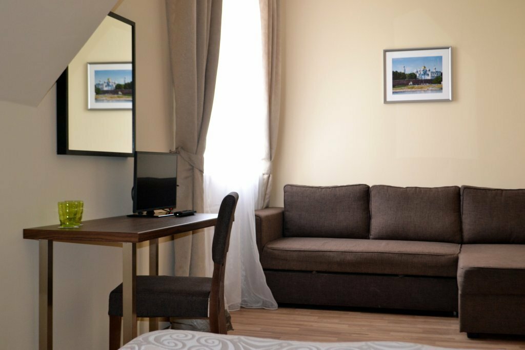 В целом понравилось, но относится к гостинице надо, как к гостевому дому скорее. Уютно, чисто, есть кондиционер. Расположен на третьем этаже административного здания, на окраине Новгорода. На машине это минут 5 до центра. Завтрак очень простой, лучше взять без и поесть в центре в кафе. Есть кухня и холодильник, где можно самим сделать бутерброд и чай. Были проездом, останавливались на одну ночь.
