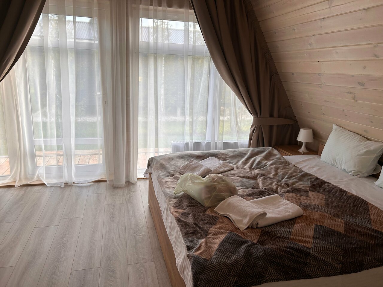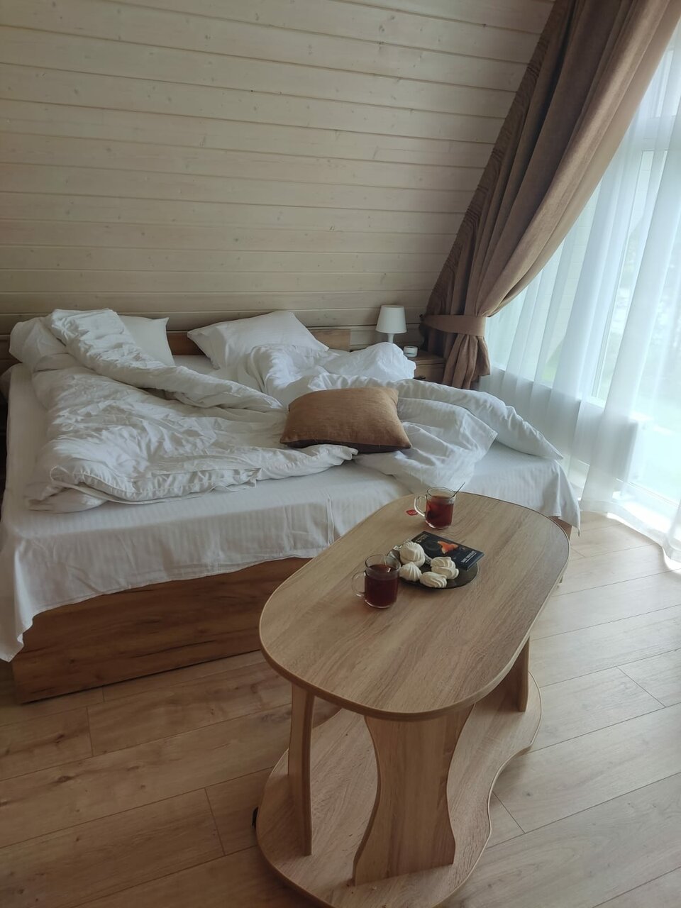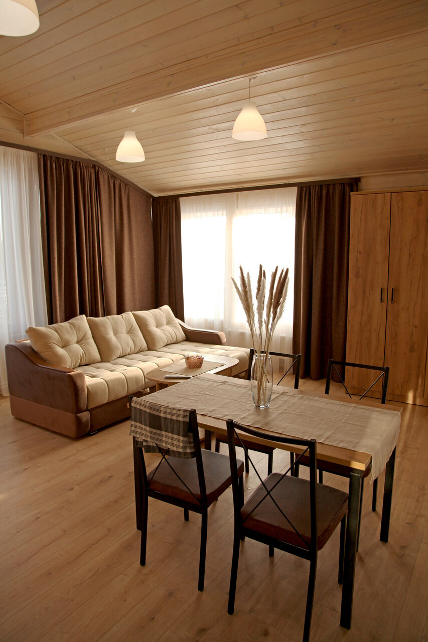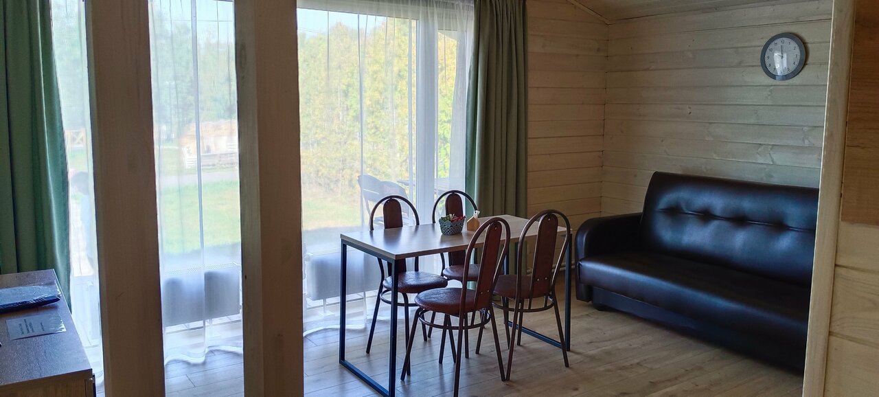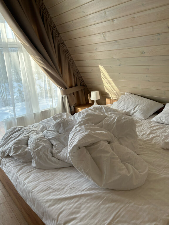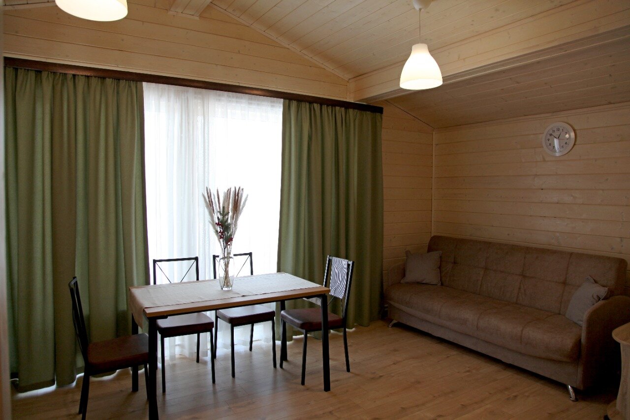 Очень хорошее место, приветливый персонал, несмотря на снегопад территория была очищена. В администрации первым встречает гостей кот Персик, чудесное мурчащее создание), девушка администратор очень приветлива, всё подскажет и объяснит, также есть на территории добрый пёс и охранник на въезде, с кем можно приятно побеседовать. Домик был №18, мини. Чистый, теплый (газовый котел, попросили добавить отопление в самом начале). На кухне есть все необходимое, но если вы хотите разгуляться с размахом и приготовить что-то основательное, то берите свои кастрюли/сковородки и посуду. В доме гостиная/кухня, с/у совмещенный и 2 спальни, одна видовая с большим окном под потолок, вторая поменьше и с небольшим окном, идеальный вариант на 4х. Хорошая постель, одеяла и подушки, но матрас не понравился, середина нормальная, а края промятые или сломанные, при выезде сообщил, думаю исправят. В общем все супер, нам понравилось, обязательно приедем еще летом!