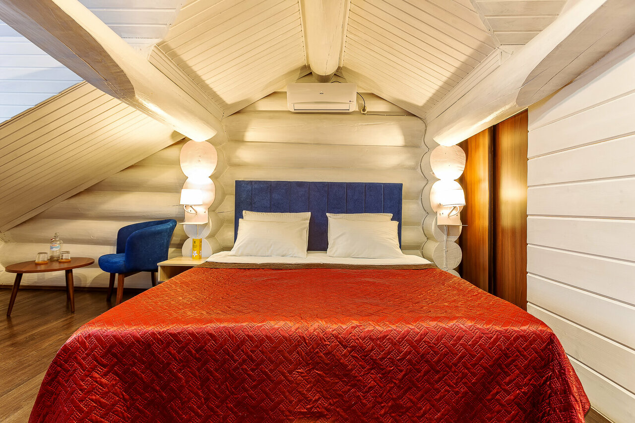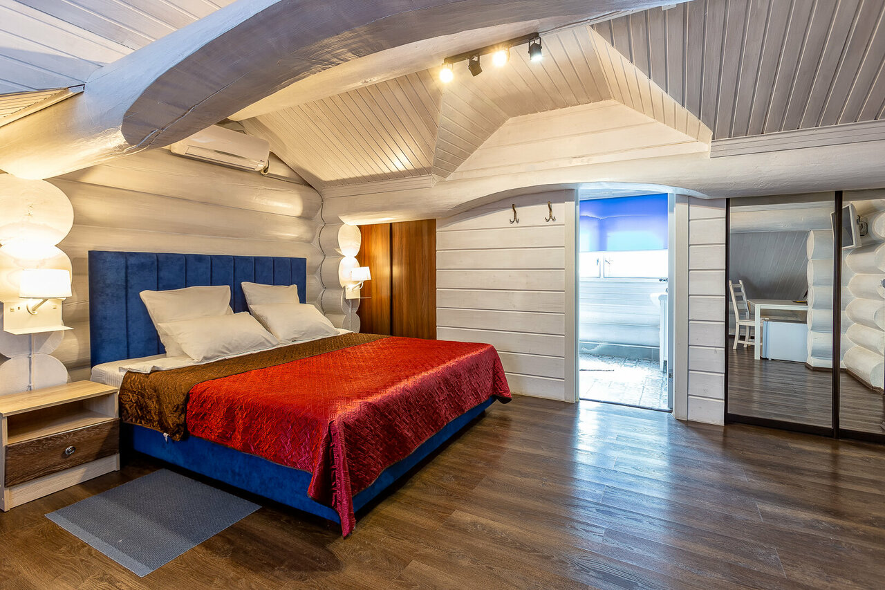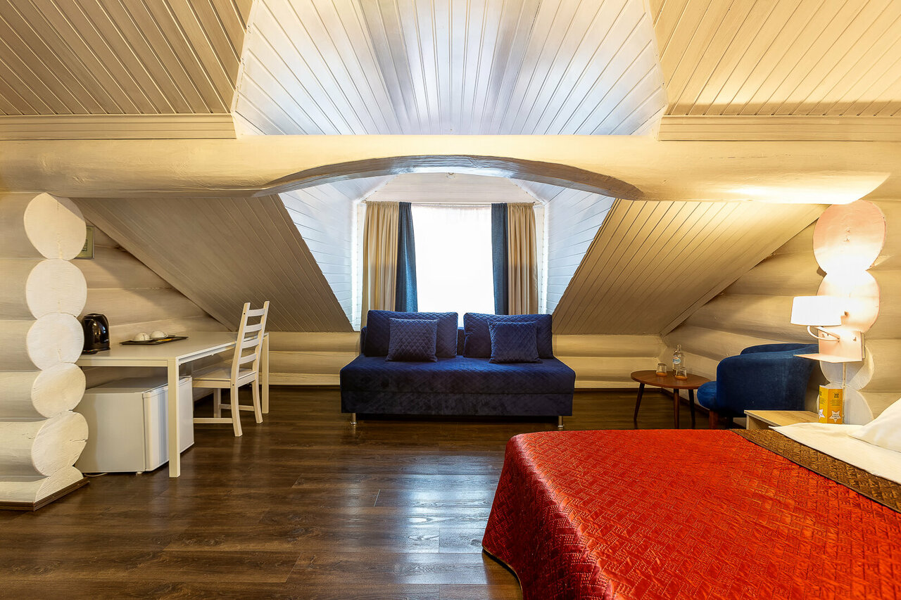 Cвелый четырех местный номер с одной большой кроватью размера king-sizе.Дополнительное спальное место (двуспальный диван)Цена указана при размещении двух человек. Дополнительное место оплачивается отдельно. Стоимость доп.места 500 рублей/чел.