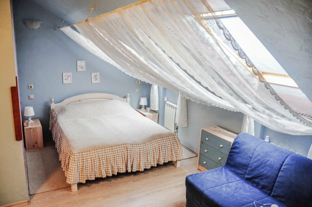 Довольно вместительный номер, русская печь создает атмосферу, сан узел подустал, но цена со скидкой примиряет с этими мелочами. Есть возможность для барбекю. В шаговой доступности великолепная крепость.