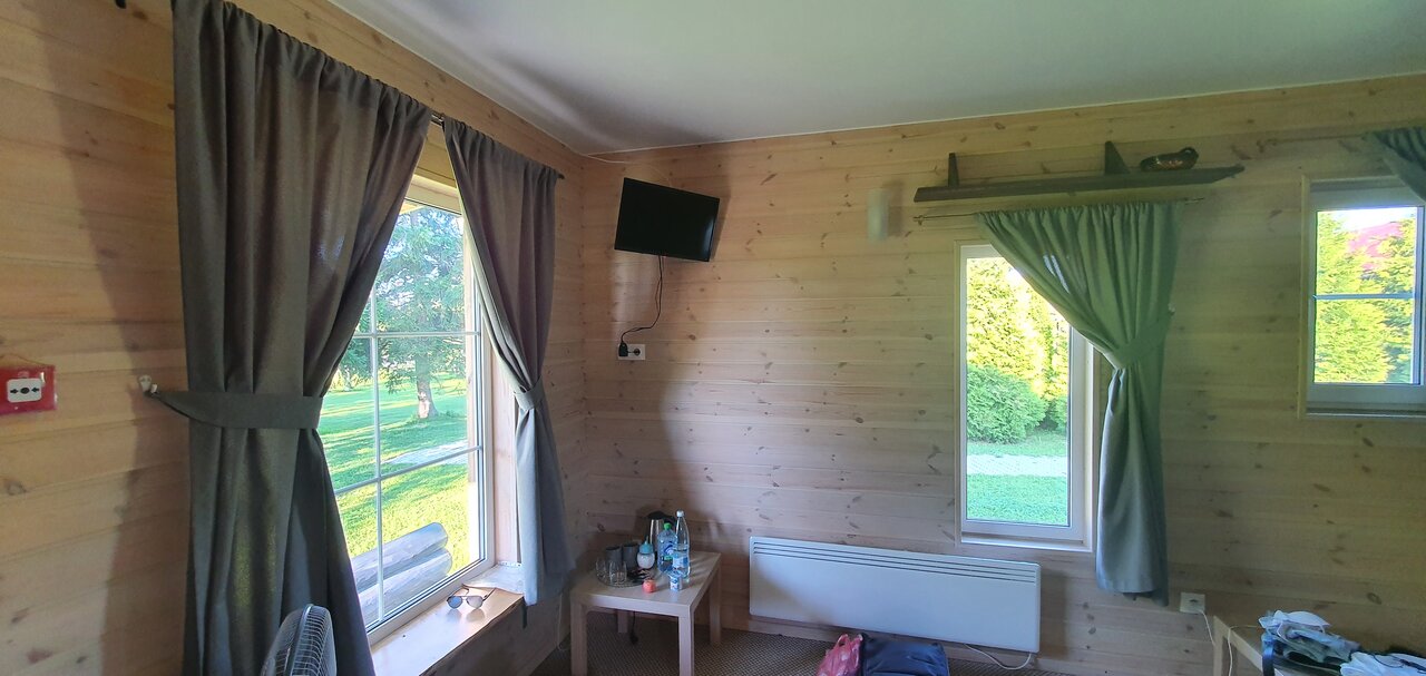 Гостиничный комплекс ещё ‘свежий’ — ему чуть больше 2-х лет. Мы жили в домике, где 2 комнаты: - гостиная — прихожая, раскладной диван (на 2 спальных места) , телевизор, 2 столика, чайник с бутылкой воды ‘Шишкин лес’, 2 кружки, 2 стакана; - спальня: 2 раздельные односпальные кровати, тумбочка, вешалки. Санузел совмещённый. Душ, водогрей, электрический полотенцесушитель. Что было хорошо: - чистое постельное бельё, полотенца, - в номере чисто, вкусно пахло деревянной обшивкой самого домика, - вода, пакетики чая, одноразовые мыло, шампунь, гель для душа, - на территории есть ресторан, работающий с чт по всему, еду готовят быстро, - в стоимость номера входил достаточно плотный завтрак. Из минусов: - трасса рядом, слышен был шум авто, - немного заносчивый налёт обслуживания в ресторане.