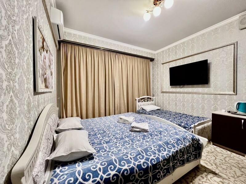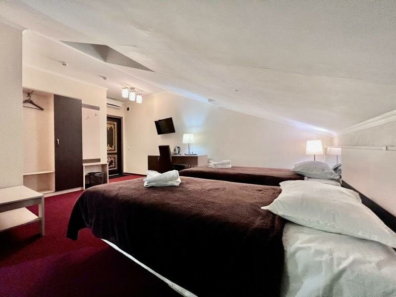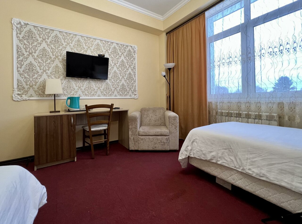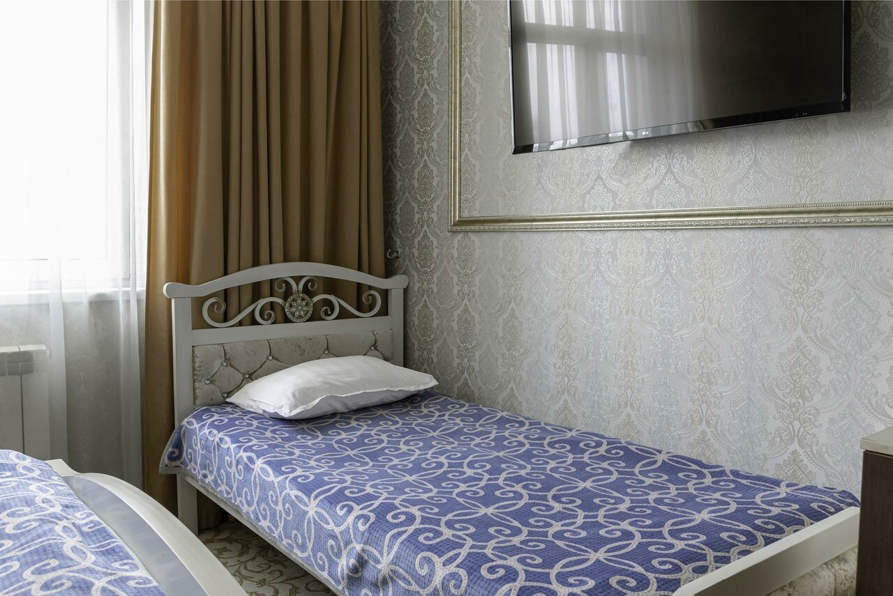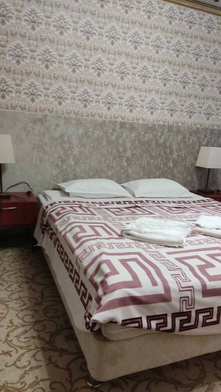 Фотографии из интернета не соответствуют реальности. Заселили совершенно в другой номер, на сайте были фотографии другого. Убитое здание без вывески. Внутри затхлый запах и ощущение грязи. В номере плесень и подтеки, заклеенные скотчем. Бронь на 1+2 детей на ночь обошлась в 3450. Воды, чайника, работающего тв, в принципе ничего для комфорта в номере нет. Одно затрепанное полотенце на гостя. Постель также не белая, застиранная и потрепанная. Завтрак — отдельная песня, чай из пластиковых стаканчиков и холодная глазунья из двух перепелиных яиц. Не рекомендую ни в каком случае.