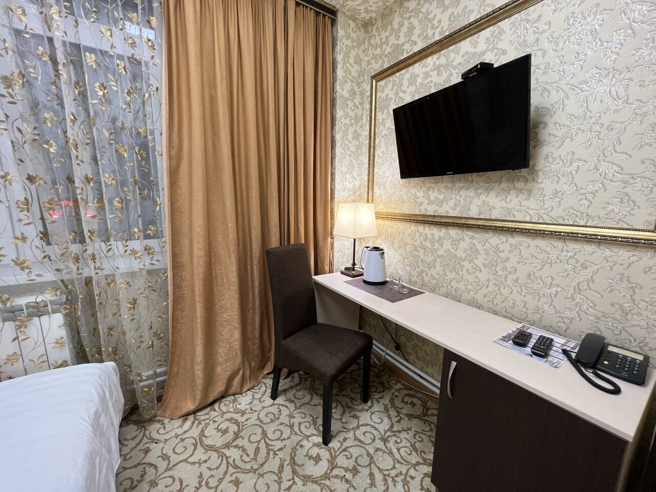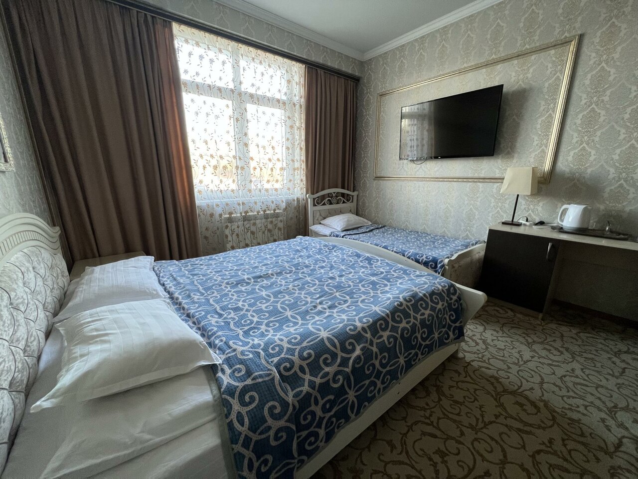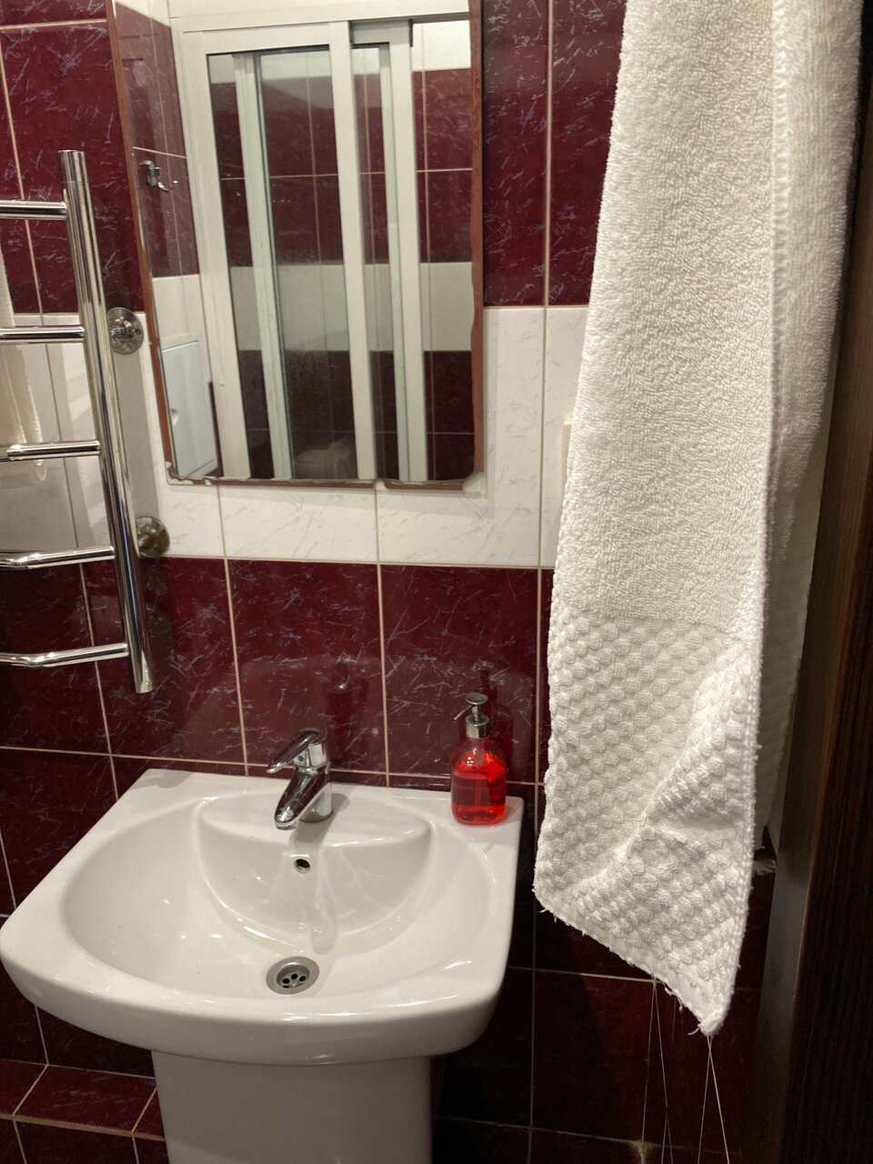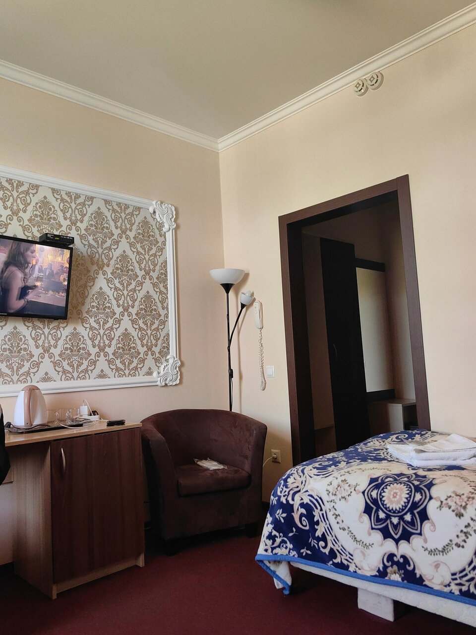Фотографии из интернета не соответствуют реальности. Заселили совершенно в другой номер, на сайте были фотографии другого. Убитое здание без вывески. Внутри затхлый запах и ощущение грязи. В номере плесень и подтеки, заклеенные скотчем. Бронь на 1+2 детей на ночь обошлась в 3450. Воды, чайника, работающего тв, в принципе ничего для комфорта в номере нет. Одно затрепанное полотенце на гостя. Постель также не белая, застиранная и потрепанная. Завтрак — отдельная песня, чай из пластиковых стаканчиков и холодная глазунья из двух перепелиных яиц. Не рекомендую ни в каком случае.