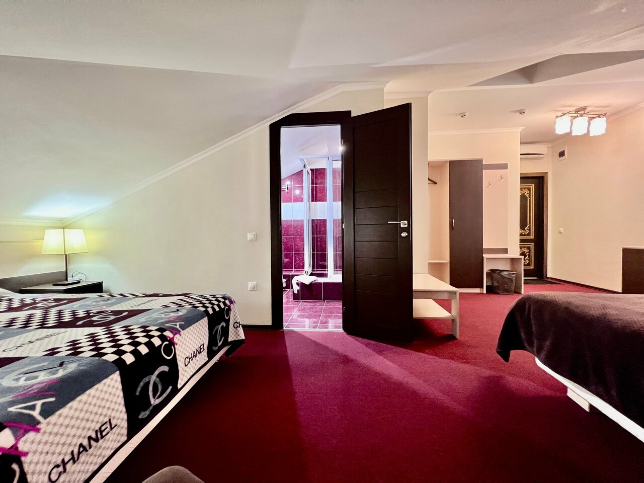 Роскошный номер имеет изысканный и уникальный дизайн, оснащен новой комфортной мебелью и современной техникой. Необычная подсветка и стильные детали добавляют номеру невероятную атмосферу тепла и уюта. В гостиной находятся: удобный диван, чайная с...