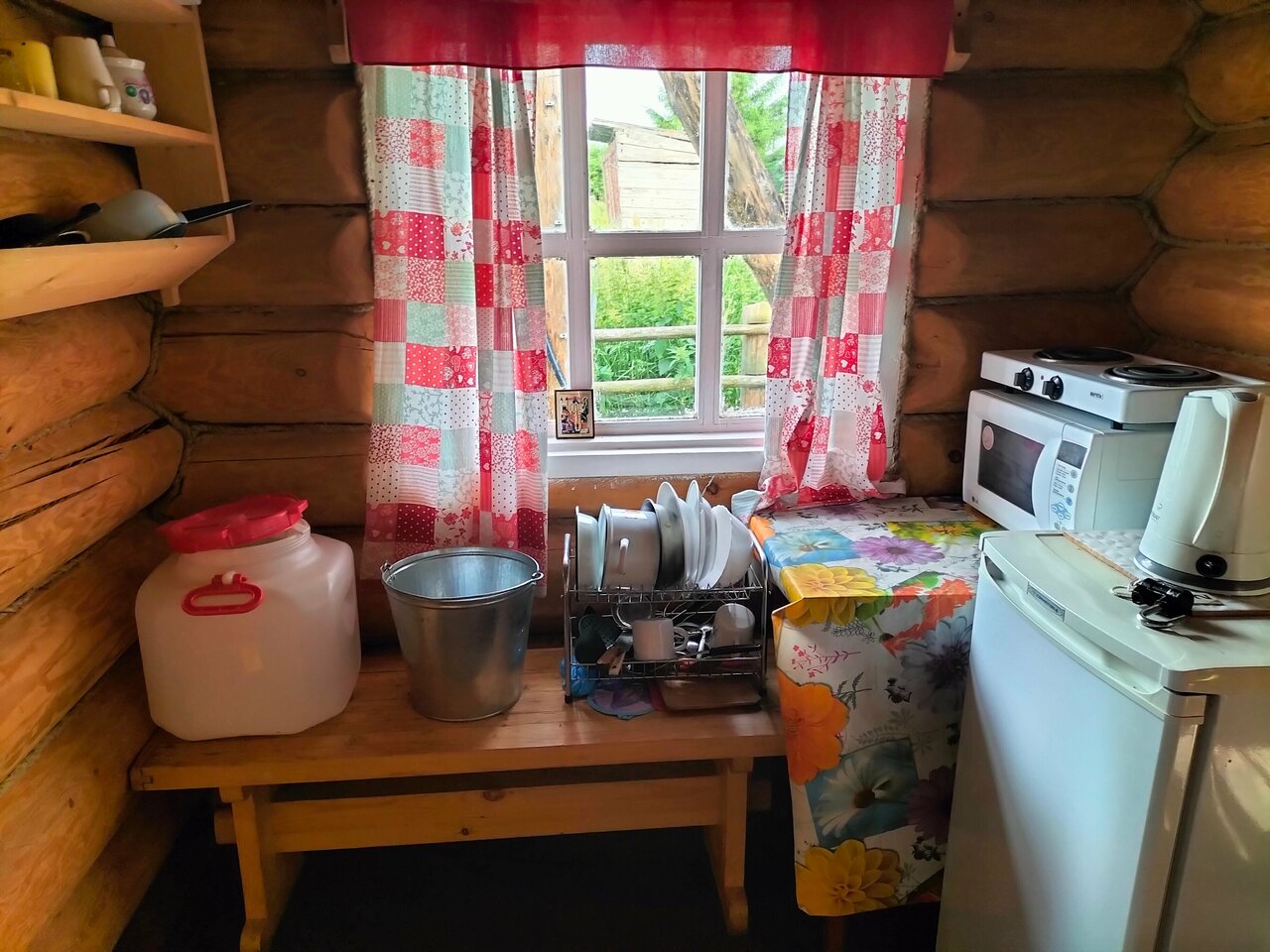 Очень неразумно оформлена так называемая кухонная часть дома. Положить продукты места нет. Готовить на плитке крайне не удобно из-за того что она очень близко то к холодильнику, то к тарелкам. Что-то нарезать тоже места нет. Зато все занято баками с водой и тремя мусорными ведрами. Идея с ведрами вроде хорошая, но вас поставит в тупик куда нужно выкидывать жестяную банку от консервов. Из металлов указан почему то нарочито только аллюминий. А еще нет лодки. По факту ролучается что изба больше для рыбаков (у них все с собой), а не посетителей Кенозера