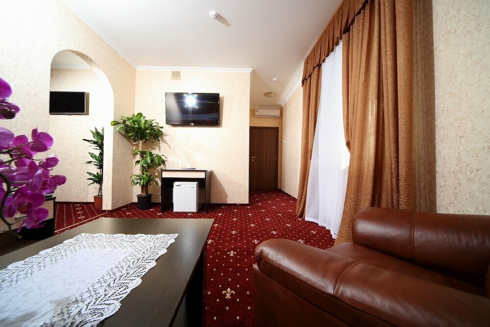 Просторный 2-комнатный ЛЮКС площадью 65 м². Оснащение номера: душевая кабина, ванна, биде, фен, холодильник с мини-баром, завтрак, телефон, Wi-Fi бесплатный, сплит-система, лоджия, телевизор, сейф.