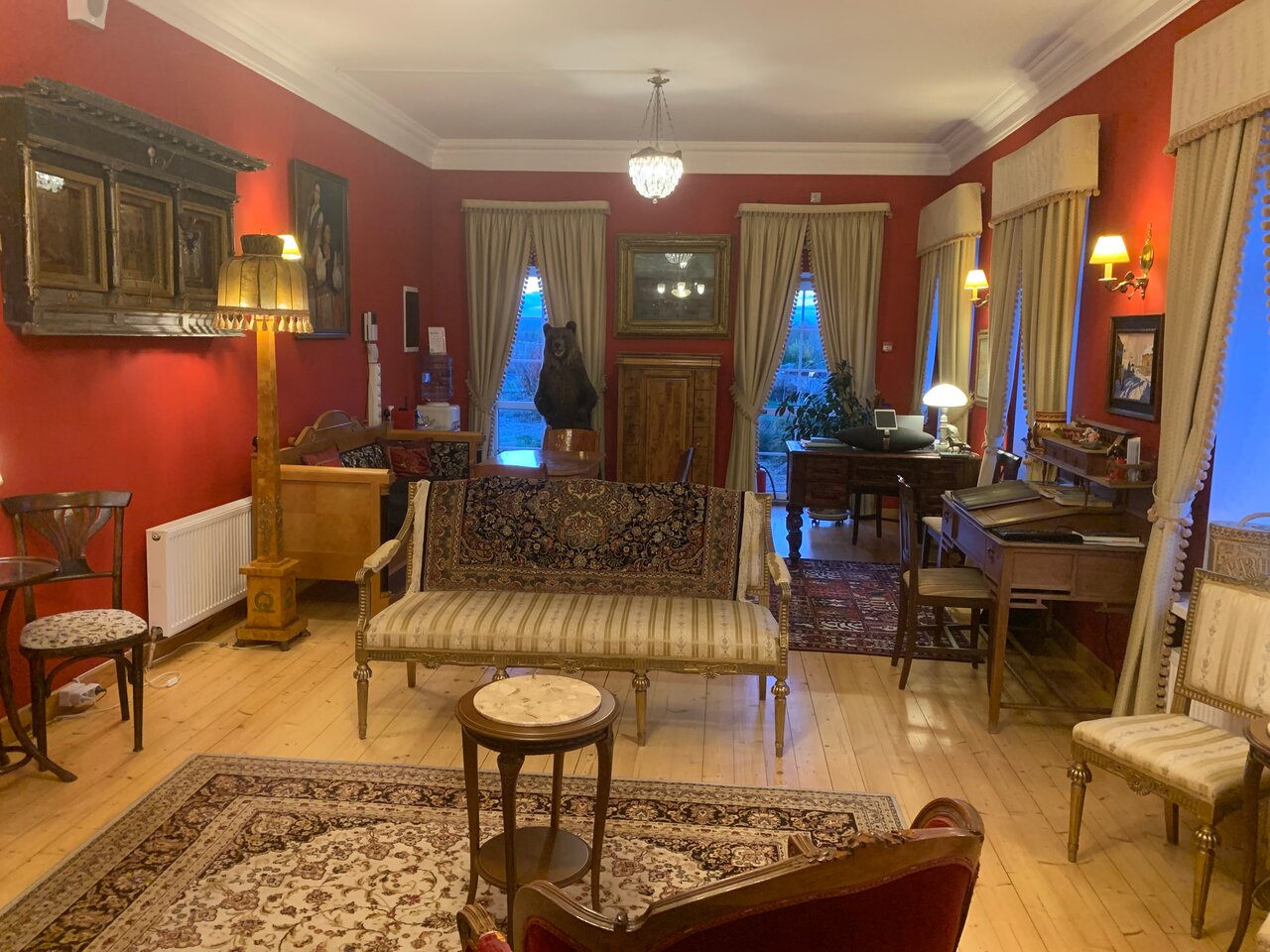 Уютный номер с пушистым ковром, торшером и трюмо, маленькой дверью-кладовкой, за которой сидит нет-нет, не Гарри Поттер, а Домовёнок Кузя. Всё так лампово и приятно, но со своим вкусом. Если бы моя бабушка жила в эпоху декаденса, это был бы интерьер её жилья. Из крана течёт вода с благоуханием сероводорода, но это даже необычно. Сначала ты фукаешься, а потом умиляешься. Странное место, всё в нём хорошо, даже слишком