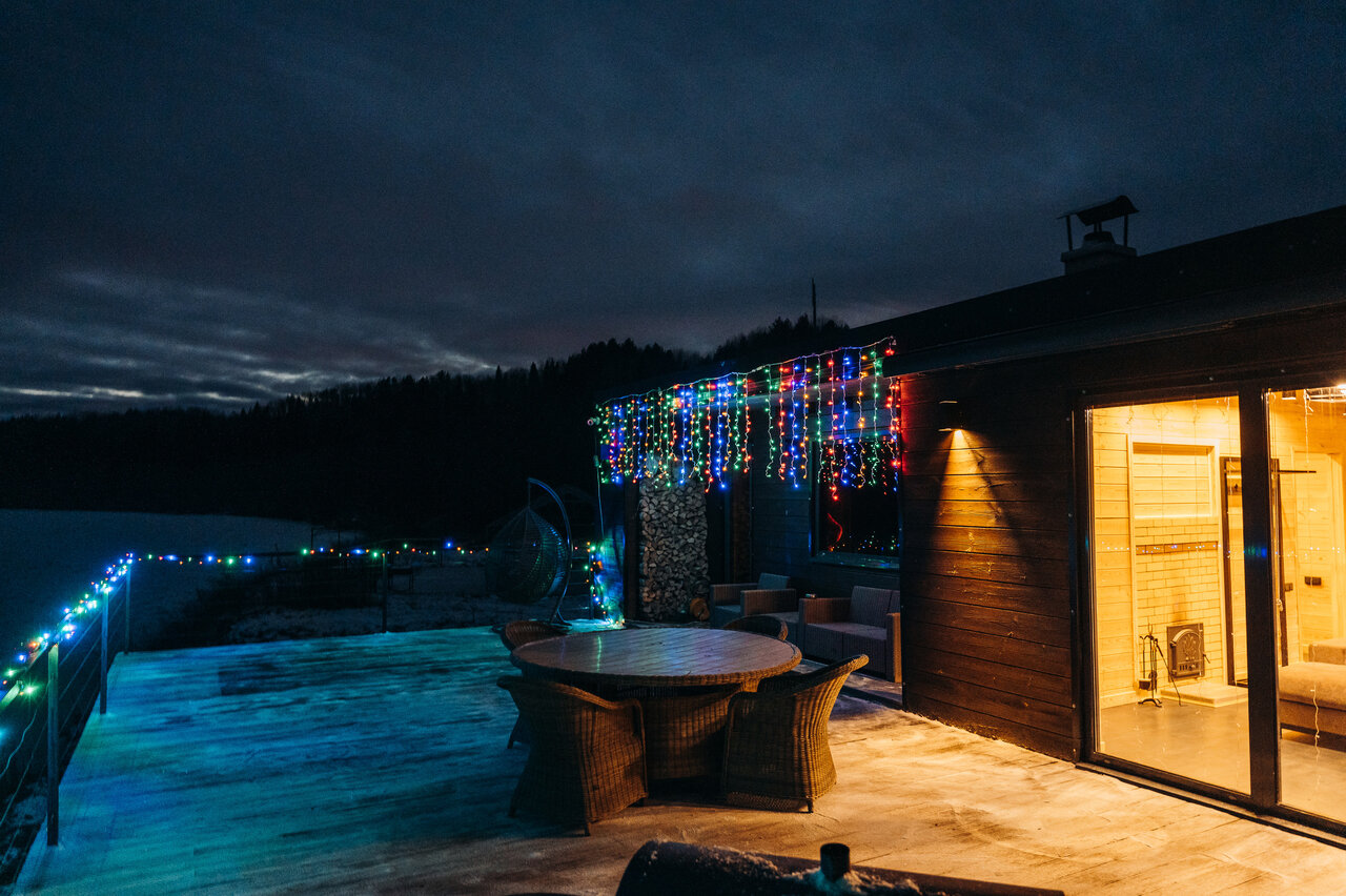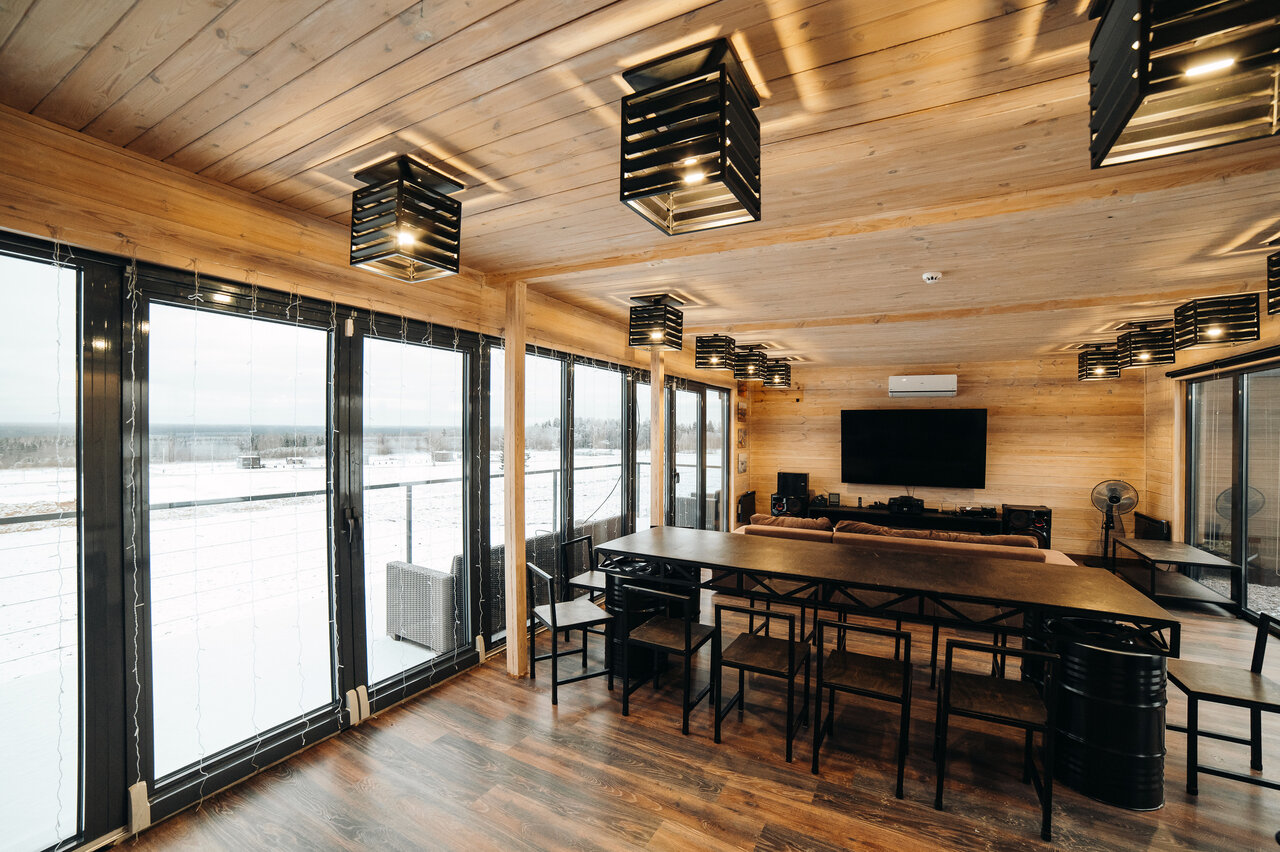 - Удобное расположение (удаленность от цивилизации, тишина).; Чистые и уютные домики.; Разнообразные развлечения (охота, рыбалка, грибы, пляж).; Приятный и дружелюбный персонал.; Панорамные окна в домиках.