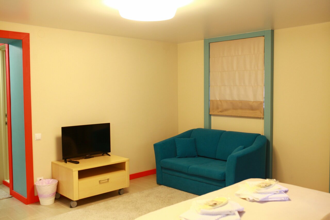 Это прекрасное место! Я в восторге. Жили в номере стандарт, особо отличия от люкса не почувствовала, в последнем теплый пол в ванной и вентилятор, плюс площадь побольше. В самой гостинице на первом этаже есть кухня с посудой, термопот и чай/кофе; плита, микроволновка. В общем если захотите готовить сами — условия есть. На минус первом: бильярд и настольный теннис. Напротив гостинице большая деревянная горка, работает до 18, дальше свет на ней отключают.