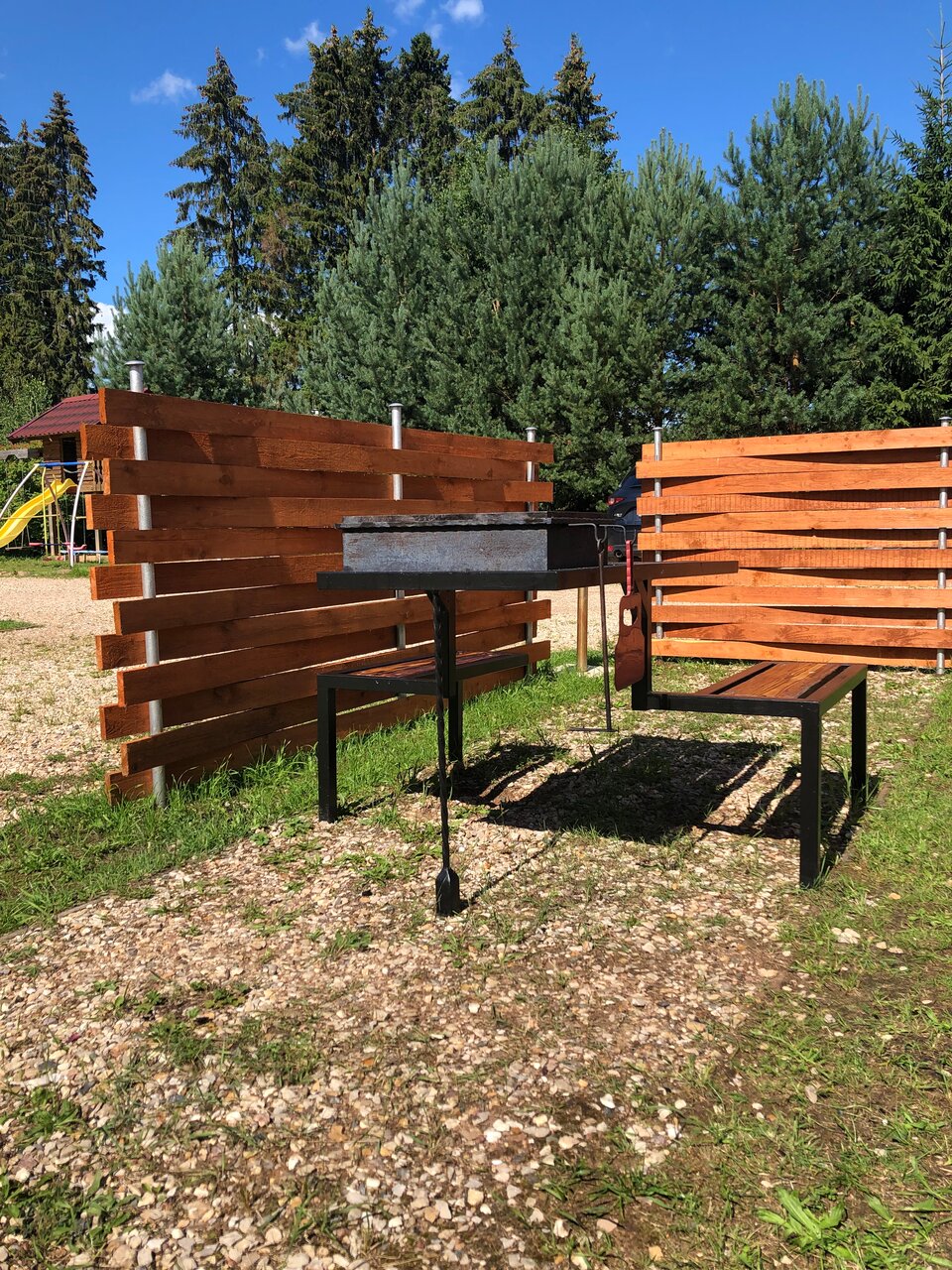 - Мангалы и столики с лавками у каждого домика.