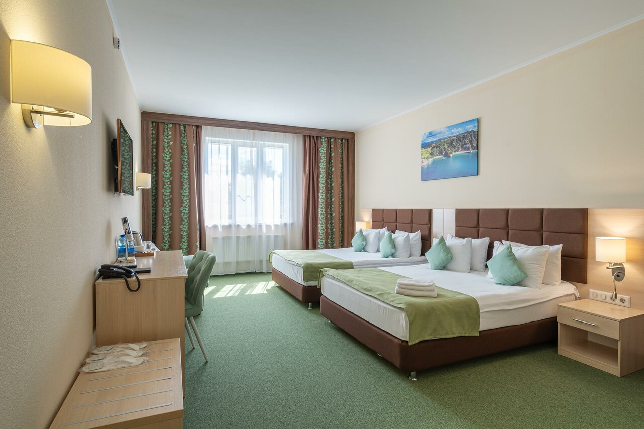 Этот стандартный номер, расположенный во втором корпусе отеля с одной большой двуспальной кроватью и одной односпальной кроватью идеально подходит как для командировок, так и для семейного проживания. В номере имеется просторный туалет с душем, бо...