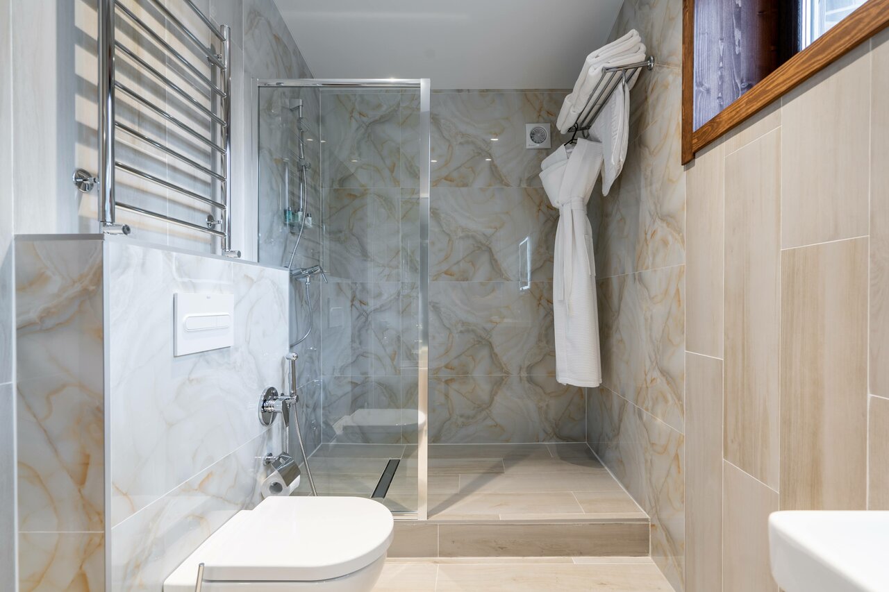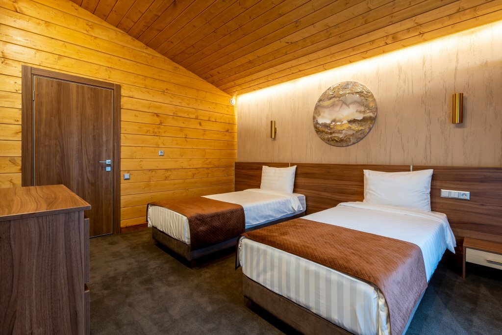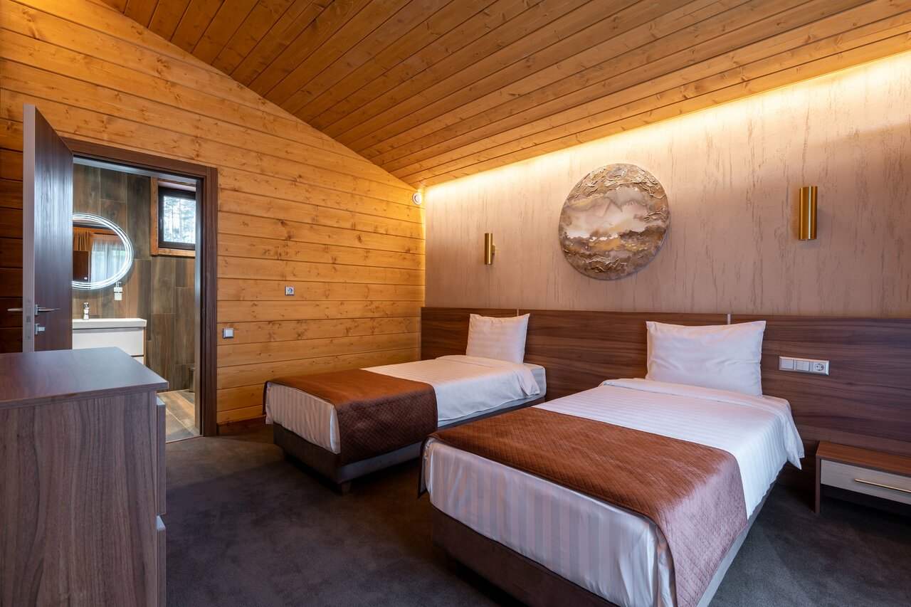 Весьма просторный и современный номер-студия со всеми необходимыми мелочами. После горнолыжного склона прогуляться босиком по тёплому (очень тёплому местами) полу особенно приятно. Вход индивидуальный, сразу в 2 шагах от парковки за домиком. Хорошо подойдёт тем, кто просто хочет отдохнуть от шума и суеты на склоне или в прогулках по лесу и не торопится вечером вернуться в город. Территория закрытая-въезд по спискам от гостиницы, поэтому по улочкам почти никто и не катается на авто.