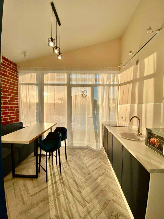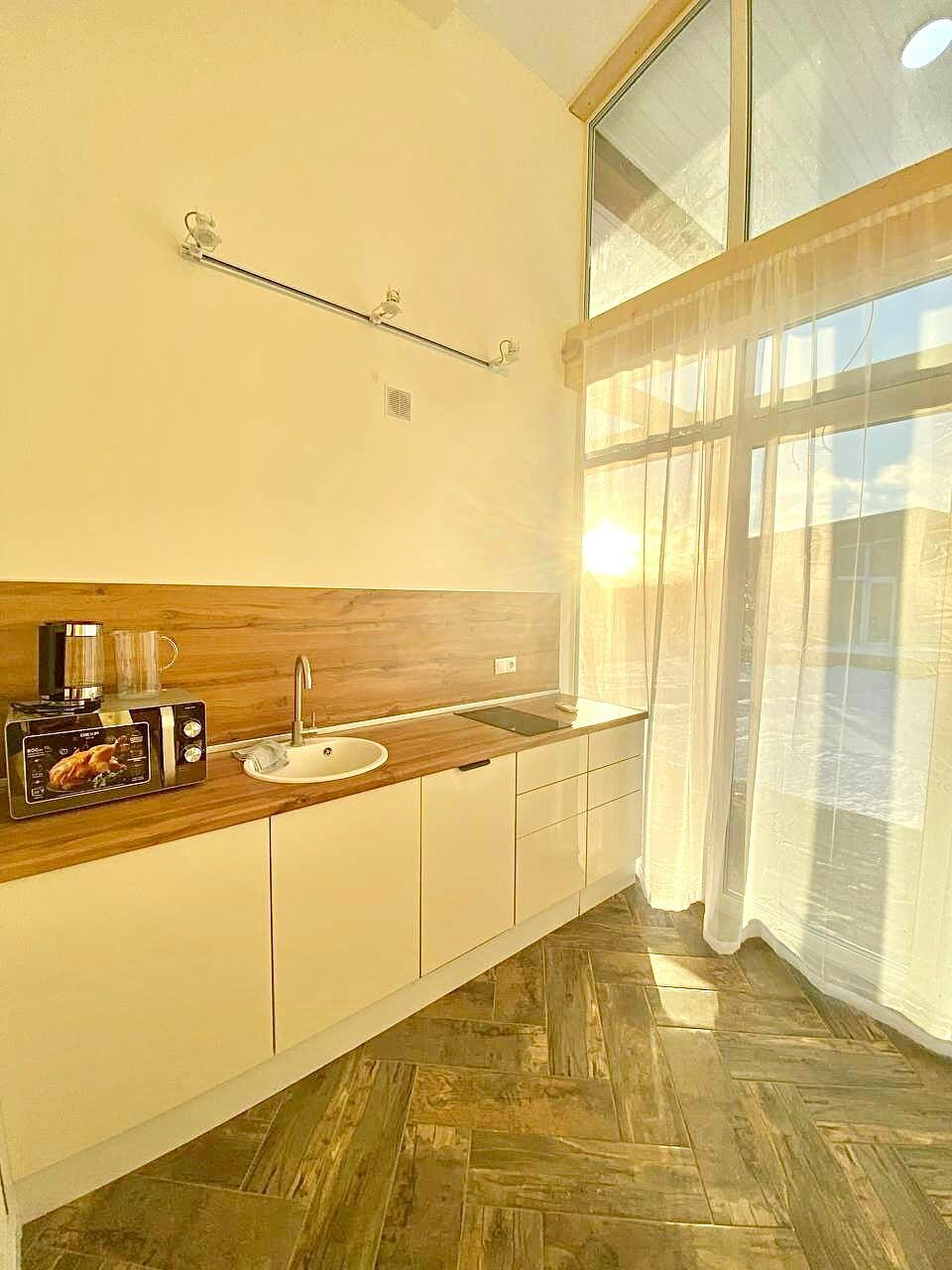 Номер с отдельным входом, спальней и кухней-гостиной. Панорамное остекление с выходом на террасу. На кухни вы найдете все необходимое для комфортного проживание, даже посудомойку и кондицеонер!