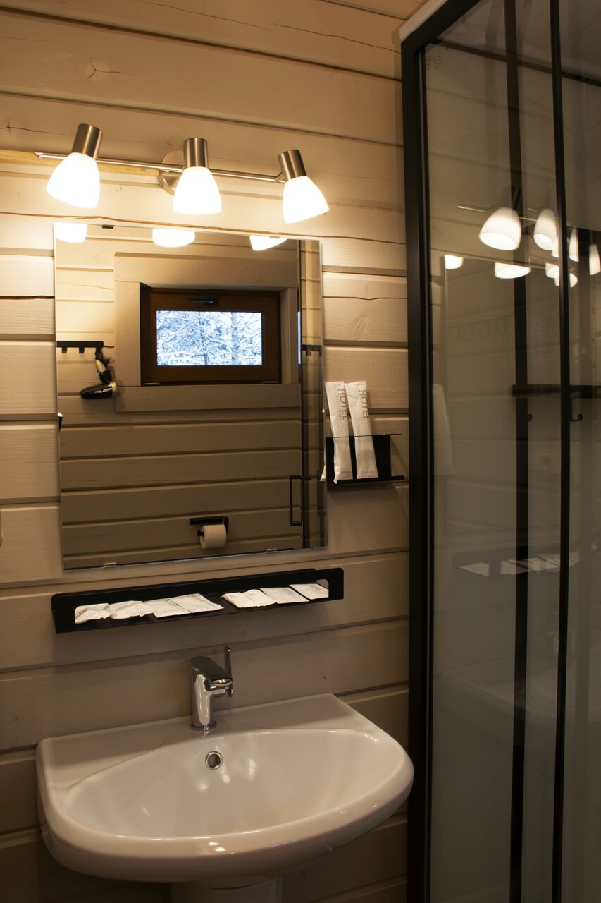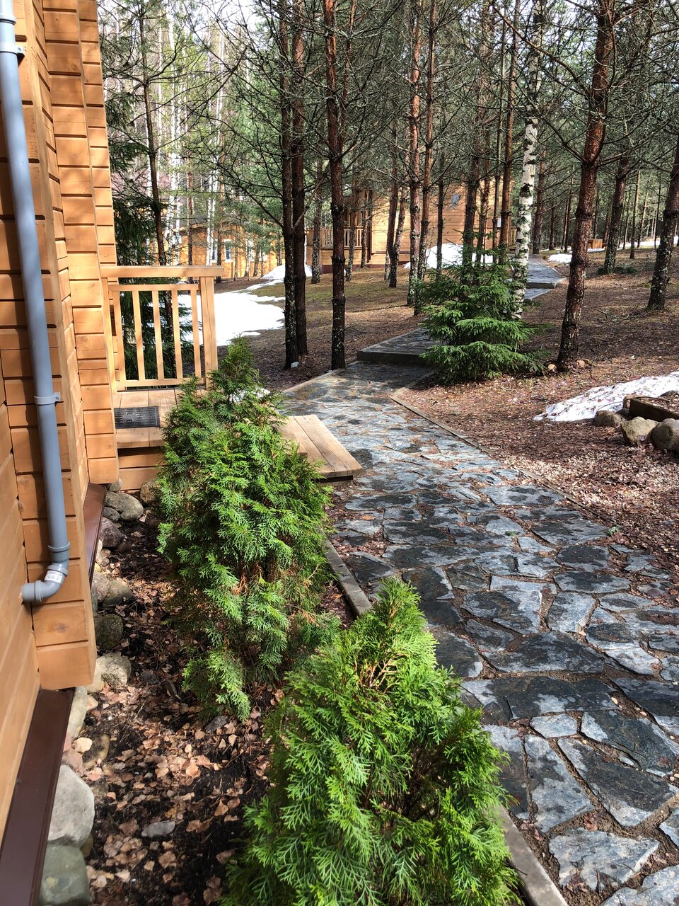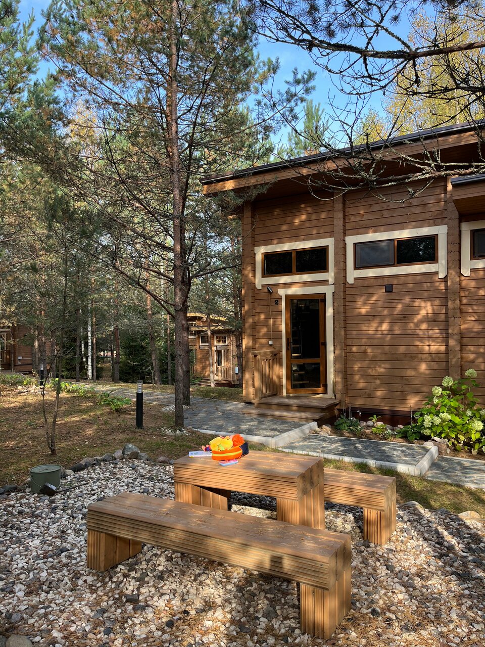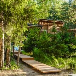 Потрясающее место! Приехали мы сюда сразу после работы. После суетного дня так приятно оказаться в тишине среди сосен. Вечером здесь очень красиво. Подсветка деревянных домиков очень уютная. Да и днём тоже везде всё хорошо) Девушка на ресепшн быстро оформила документы, рассказала о завтраке и проводила до домика. В домике есть всё необходимое. Принадлежности для душа, халаты, тапочки, чайник, чай, кофе, бокалы для шампанского, чашки, вода в бутылках. Из домика можно выйти на террасу и посидеть за столиком, любуясь прекрасным видом, вдыхая аромат леса. Выспались на очень мягком матрасе. Мы жили только одну ночь. Завтрака нам хватило до вечера, настолько сытный. Каша овсяная, сосиски, яичница, фасоль, сырники, нарезка колбасы, сыра, фруктов. Можно прогуляться до озера. Возле него есть бассейн на открытом воздухе, работающий летом. В общем, нам всё понравилось. Приедем ещё обязательно