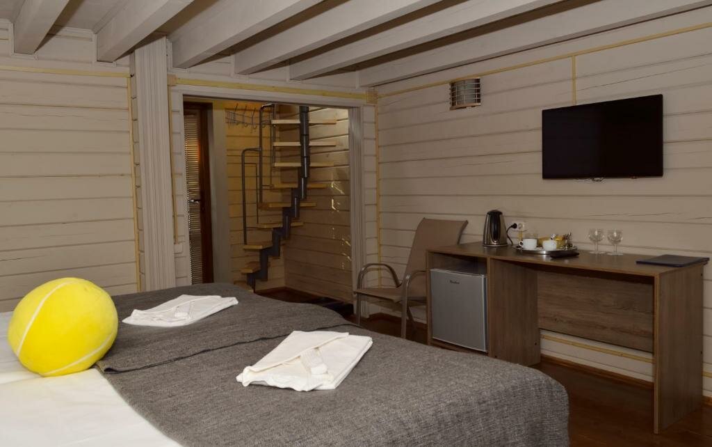 Останавливались по дороге из Питера в Тверь. Останавливались в номере с двуспальной и односпальной кроватями. Номер со всеми удобствами, включая холодильник, чайную посуду и воду. Ужинали в местном кафе: вкусно и приемлемо по цене. Смутило только поведение официантов и условная чистота скатертей, а также система расчёта и заказа блюд. Завтрак отличный. К нему заказывали кофе и десерт. Кофе принесли, а десерт ждали больше 20 минут. Уже и кофе остыл. В целом место отличное (здесь все в теме тенниса, мы одни были вне этой темы), но если бы сервис потянули, было бы совсем отлично! Природа красивая