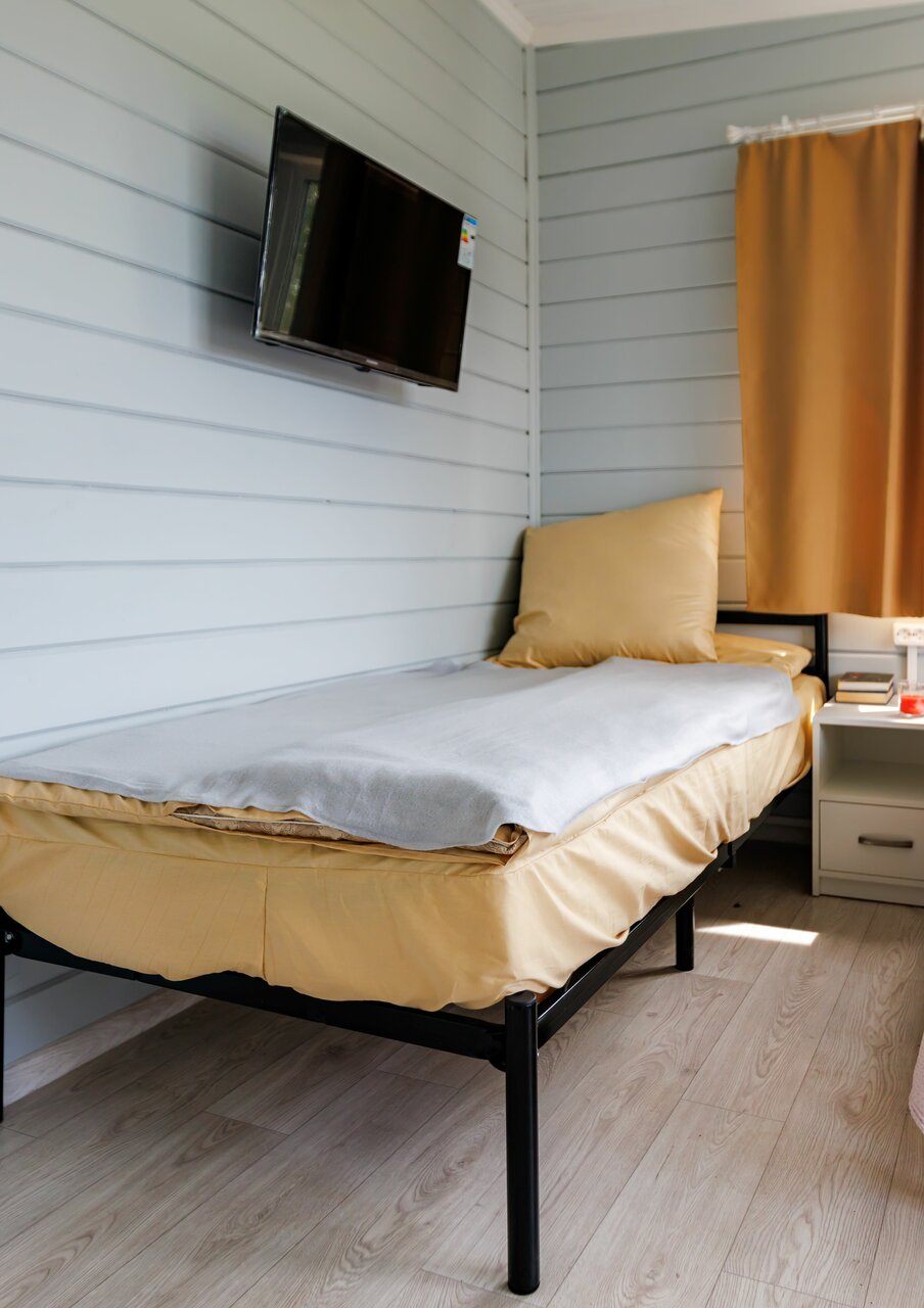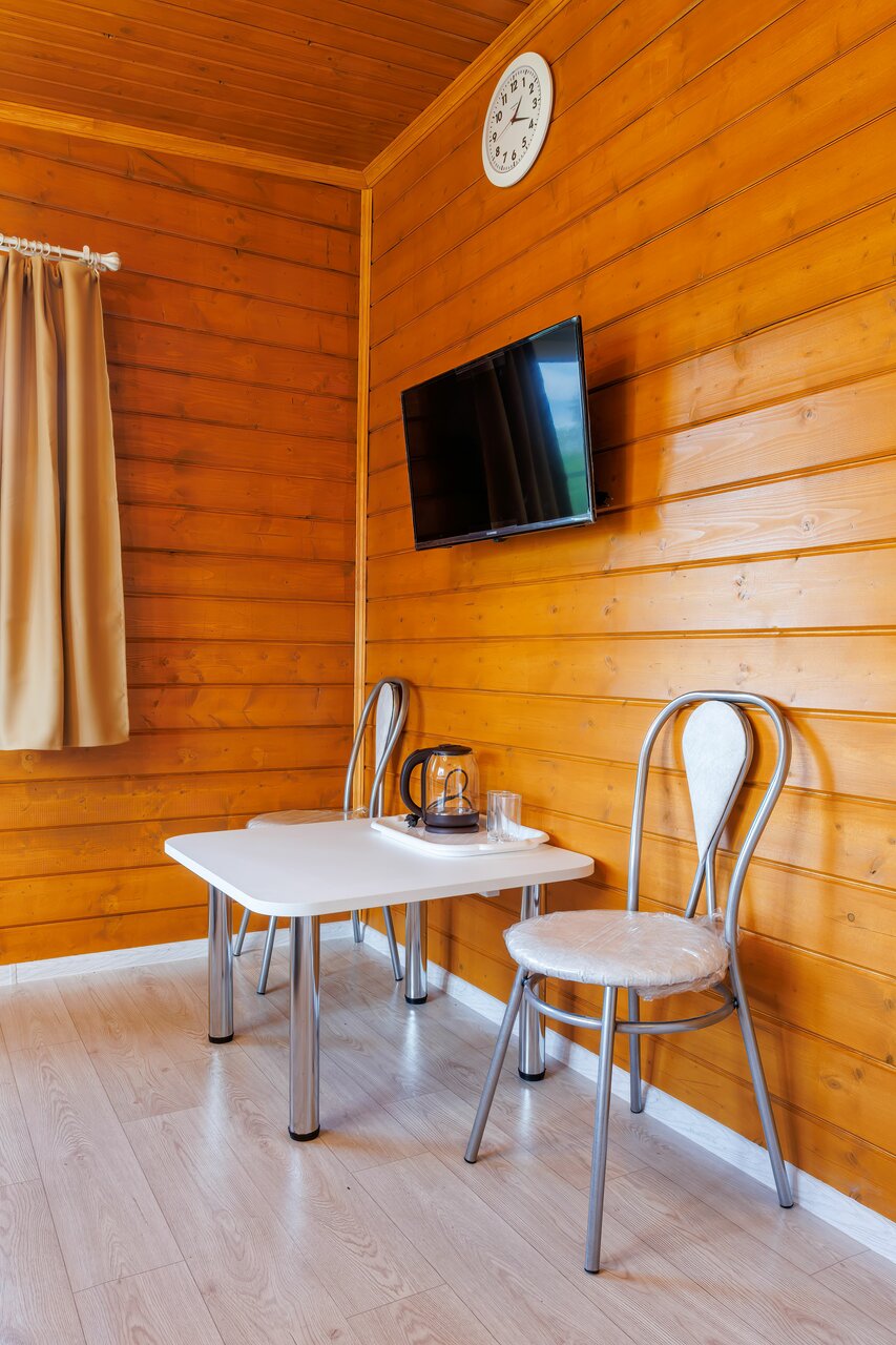 - В домиках есть микроволновка, плита, холодильник, душевая, санузел, телевизор.