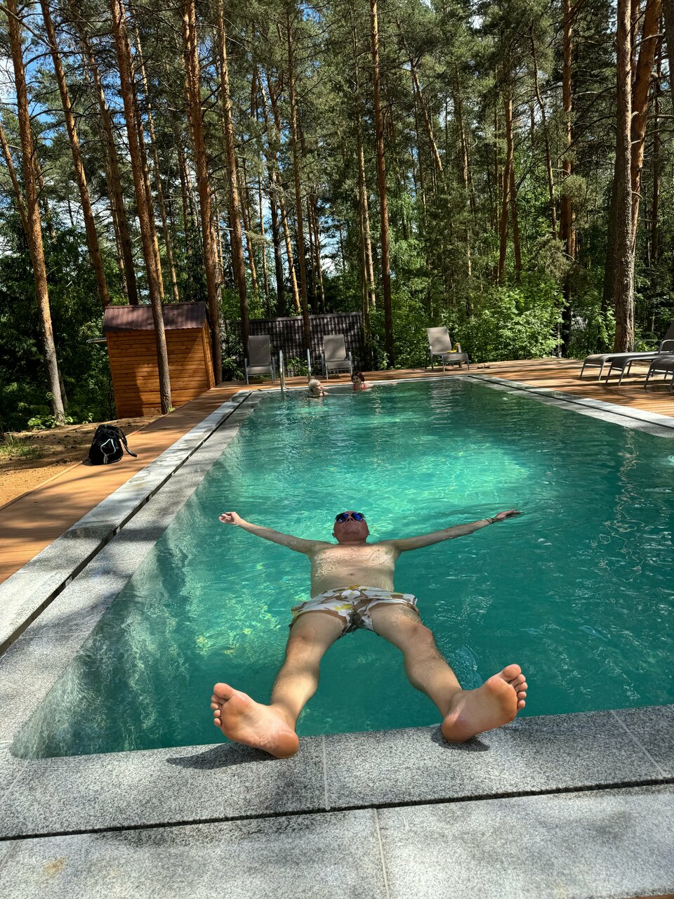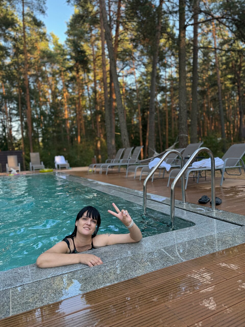 Супер. Просто восторг от места нахождения. Природа обалденная, хвойный лес, воздух чистый. Персонал адекватный, все очень приветливые, приятные в общении. Домики новые, чистые, уютные. Каждый день уборка, сразу приносят кофе, чай, воду. Бассейн в погоду при +3, теплый (температура воды — 30), да еще на свежем воздухе, на берегу реки. Народу никого, хотя домики все заняты. Каждый находит себе занятие. Небольшие проблемы были с удочками (те, которые в наличии, были сломаны), но это не испортило отдых. Можно взять велосипед. Это бесплатно. Мангал также бесплатно. Можно взять квадроцикл. А купель горячая на веранде домика с подсветкой и джакузи не поддаётся моему восторгу, выше всяких похвал и моют ее каждый день. Отдых на все 100. Приедем еще. Советуем всем, не пожалеете.