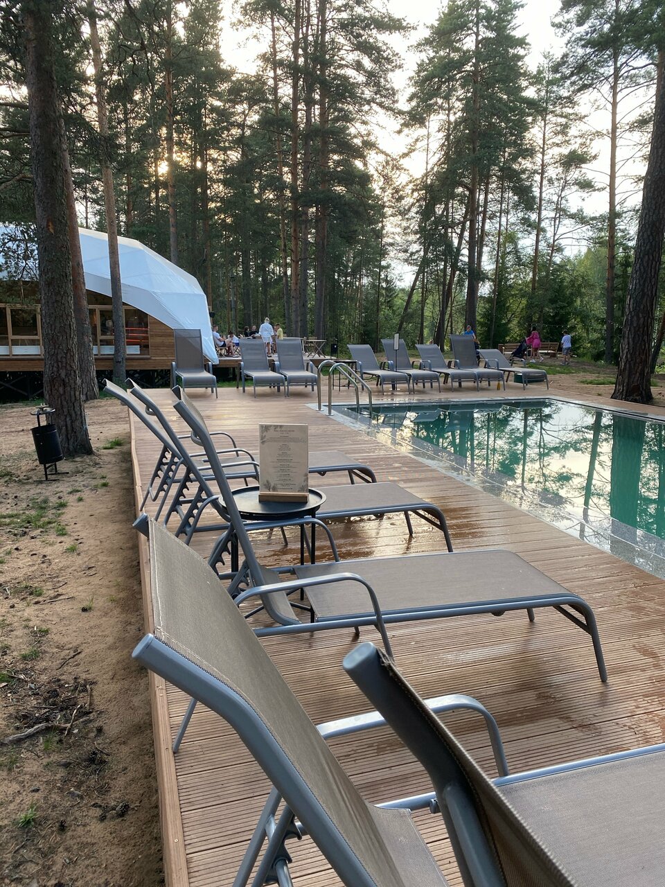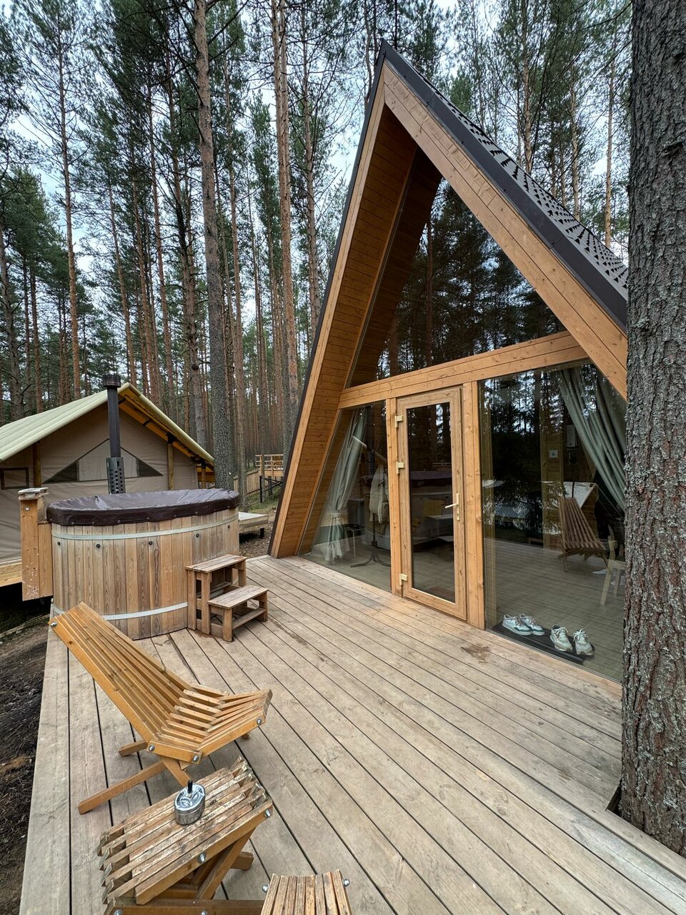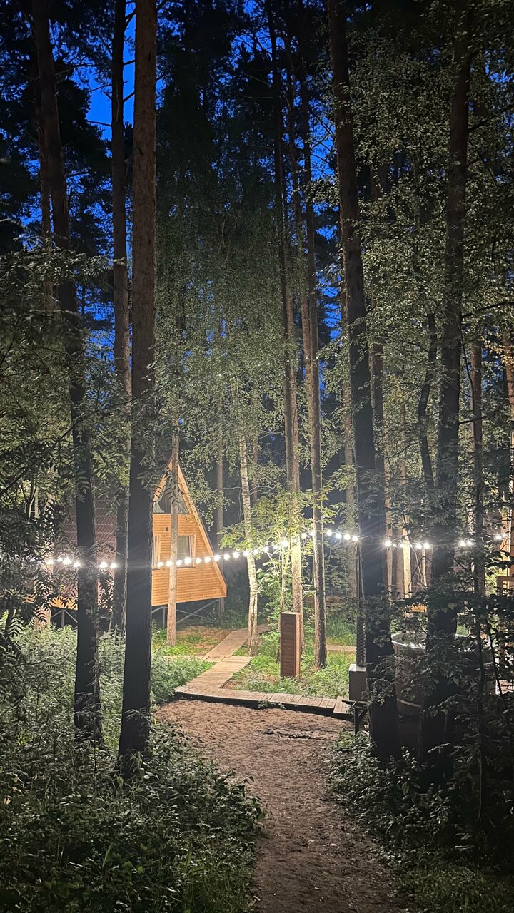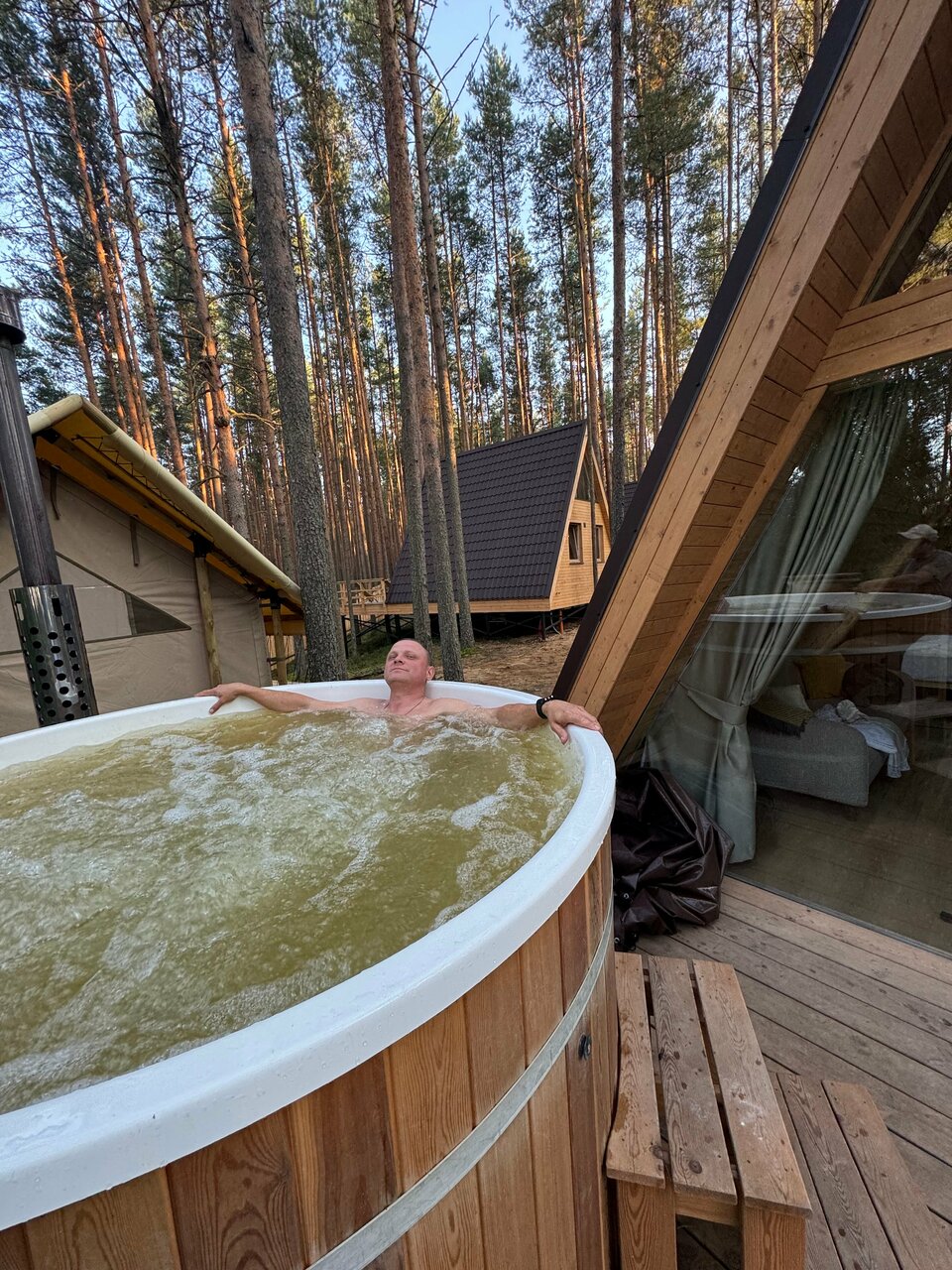 Очень удачное расположение глемпинга в сосновом бору. Красивый двухэтажный чистый домик с двумя просторными кроватями и собственным чаном. Но не хватало некоторой посуды (бегали в ресторан, где нам все предоставили). На территории расположен бассейн с водой под 30 градусов, были зимой, поэтому для меня показалось холодновато, но ребенок был в восторге. Из минусов отметила бы завтрак: еда очень холодная (ее такую и выносили) и маленький выбор. И не помешал бы у домика небольшой мангал (есть только общий возле ресторана).