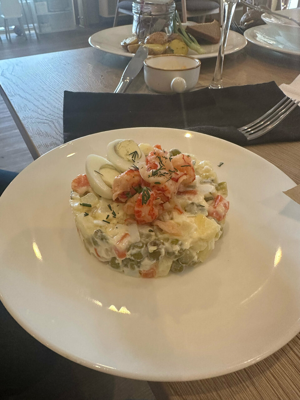 Хотели приехать сюда на выходные, но все было занято и решили просто доехать, посмотреть и поесть в ресторане. Территория прекрасная, сосновый бор просто великолепен, погулять рядом с отелем одно удовольствие. Домики очень симпатичные, бассейн классный! Снимаю звезду (хотела две, но не буду) только за ресторан! Очень расстроил, только из-за него ехали 100км. На сайте очень написано аппетитно, по факту — обслуживание вялое, совершенно не заинтересованные официанты. Чай из ягод за 890 отменный, филе судака с костями, а Оливье просто ужас. Не знаю, что случилось с поваром и что это за традиционный русский рецепт. Оцените сами — недоваренная овощная смесь из морозилки, сверху раковые шейки из банки и одно перепелиное яйцо, огромное количество майонеза. Это был худший оливье. Печально, так как само место классное и загруженность полная, а ресторан оставляет негативное впечатление. Рекомендую сменить повара и обучить официантов.