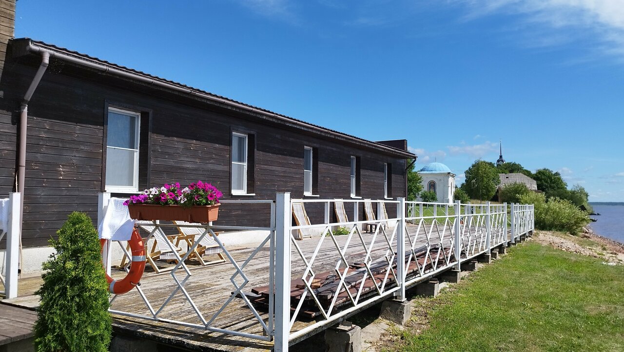 Гостиница находиться прям на берегу острова. Из окна номера вид на Псковском озеро. Тишина. Хороший и отзывчивый персонал