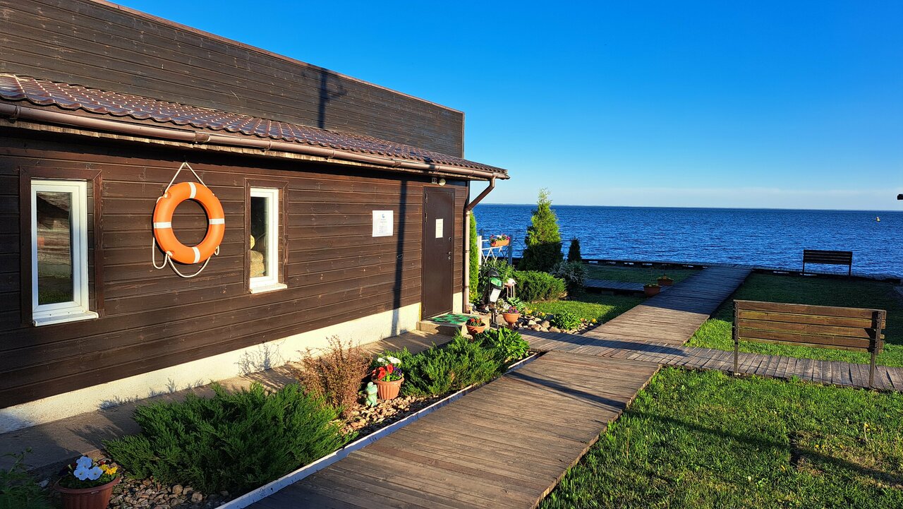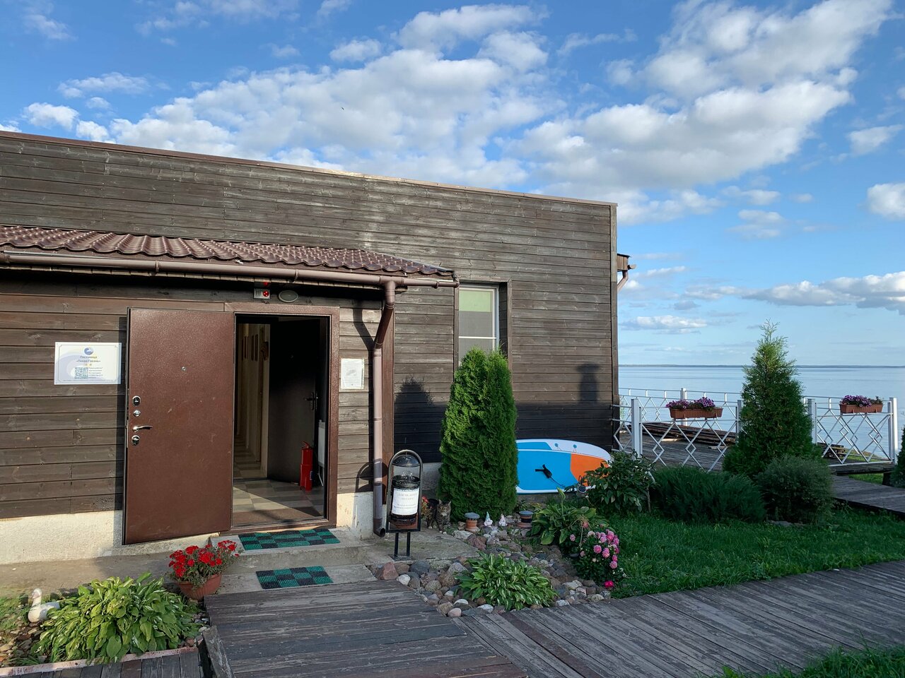 Уютный отель на берегу Псковского озера. Есть шезлонги, можно сидеть , смотреть на воду. В отеле есть кулер, чай, сахар. Рядом с отелем — ресторанчик ‘Ерш’, в котором можно столоваться.
