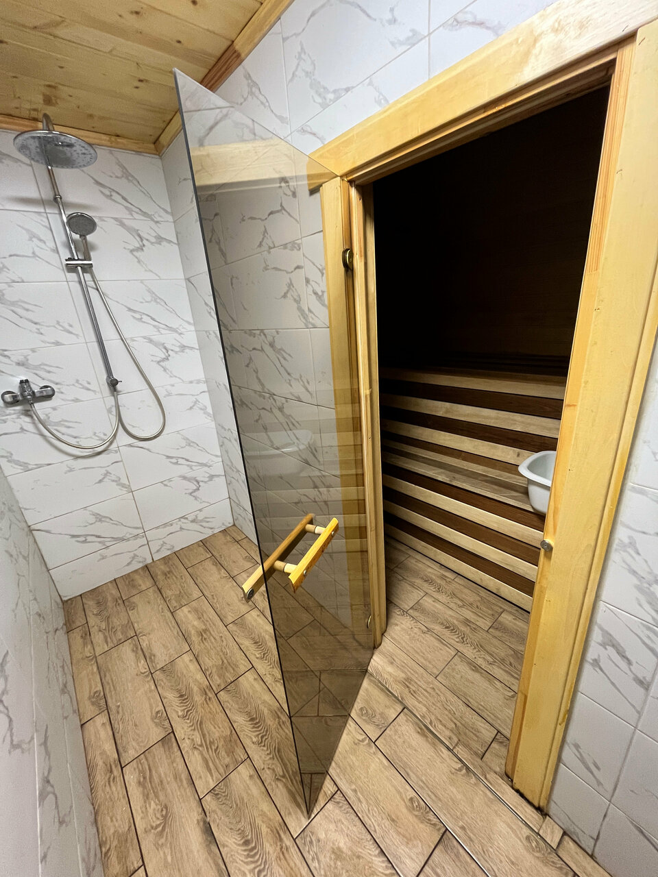 С первого взгляда все здорово! Но ночевка в домике показала, что в нем очень жарко, нет кондиционера. Дом деревянный, но стыки залиты то ли клеем, то ли силиконом и дом не дышит. Кровати не удобные. Из плюсов баня, душ большой, удобный.