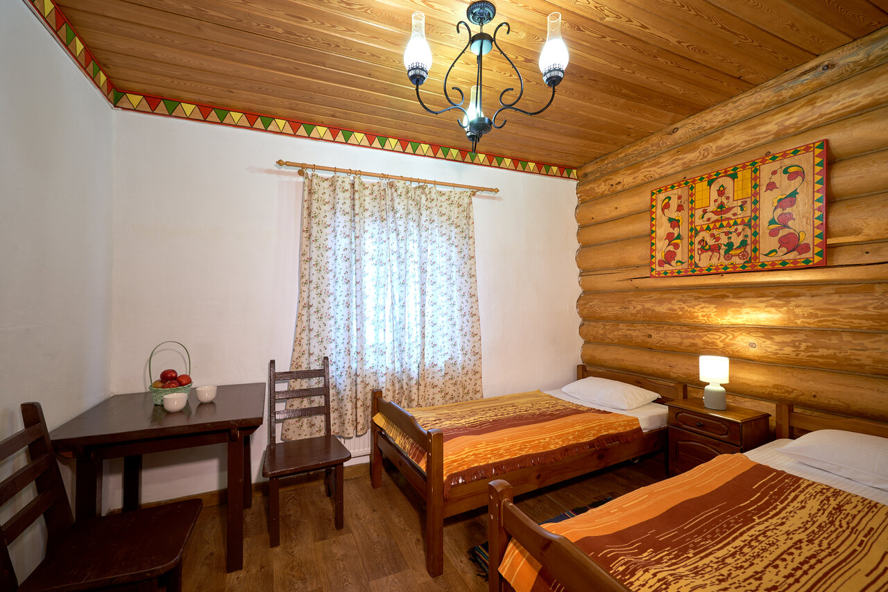 Отдыхали в двух этажном шестиместном номере 19, одну ночь, больше там не реально продержаться, почему работники не догадались что ставни когда открыты должны быть зафиксированы? Всю ночь ставни долбили просто ужасно СТУЧАЛИ, ночью спать вообще не реально, мы останавливались почти во всех отелях этномира и Подворье очень разочаровал. Причем ставни долбили не только в нашем номере ночью, все таки люди приехали отдыхать, если Вы ночью не любите спать то это лучший выбор ) в номере был чайник, полотенце, белье, кружки, телевизора нет, ну и мощные удары ставней ))