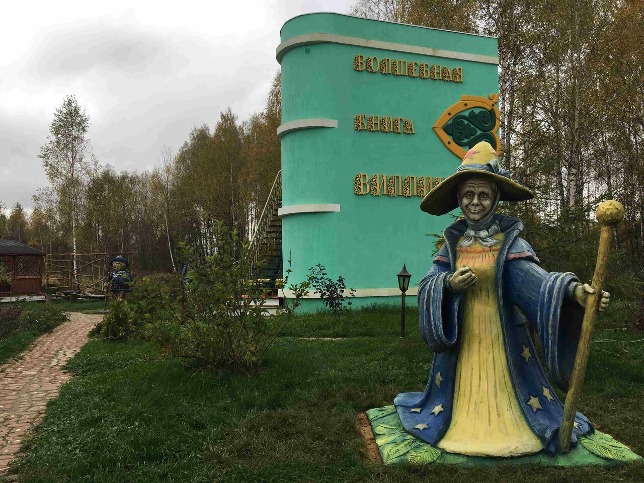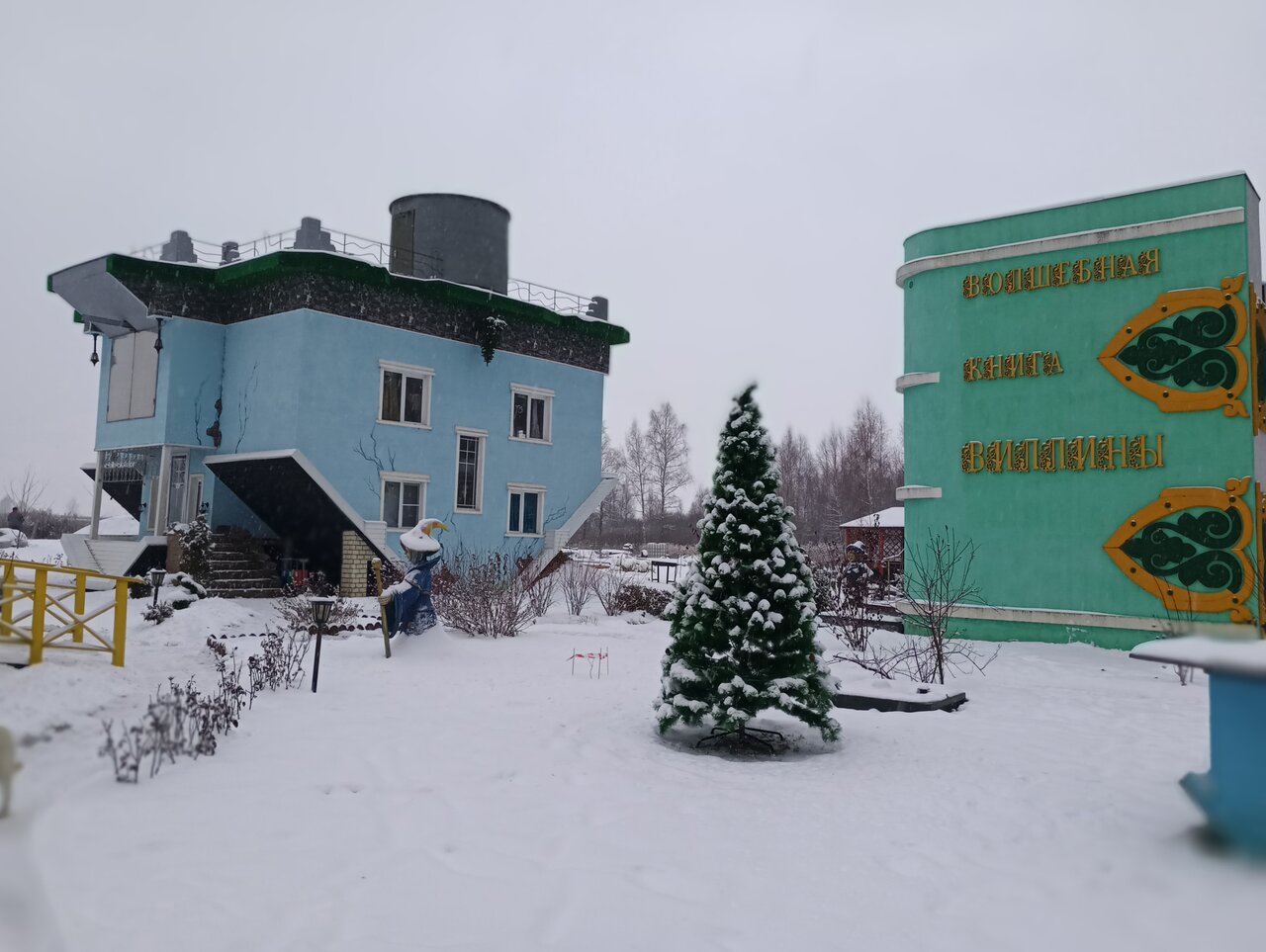 Классное место для отдыха на выходные с детьми, можно несколькими компаниями. Жили в книге на 2 этаже. Немного крутовата летница, спускаться лучше попой вперед))) К каждому домику есть мангал ручной работы в виде животных. Много разных качелей. На территории шустрые белки в вольере и упитанные еноты. Кровать двухэтажная, в принципе норм. Дети спали наверху. В номере комфортная температура (включали обогреватель минут на 20 перед сном), на улице было ок.10гр. ночью. Минус — водичка из крана с запахом. Читали отзывы заранее, поэтому питьевую привезли с собой. На территории перевернутый дом, проживающих пускают походить бесплатно (если никто не живет). До Этнопарка возят на Газельки, но можно и пешком (обратно так и пришлось, ибо загулялись там до поздна).