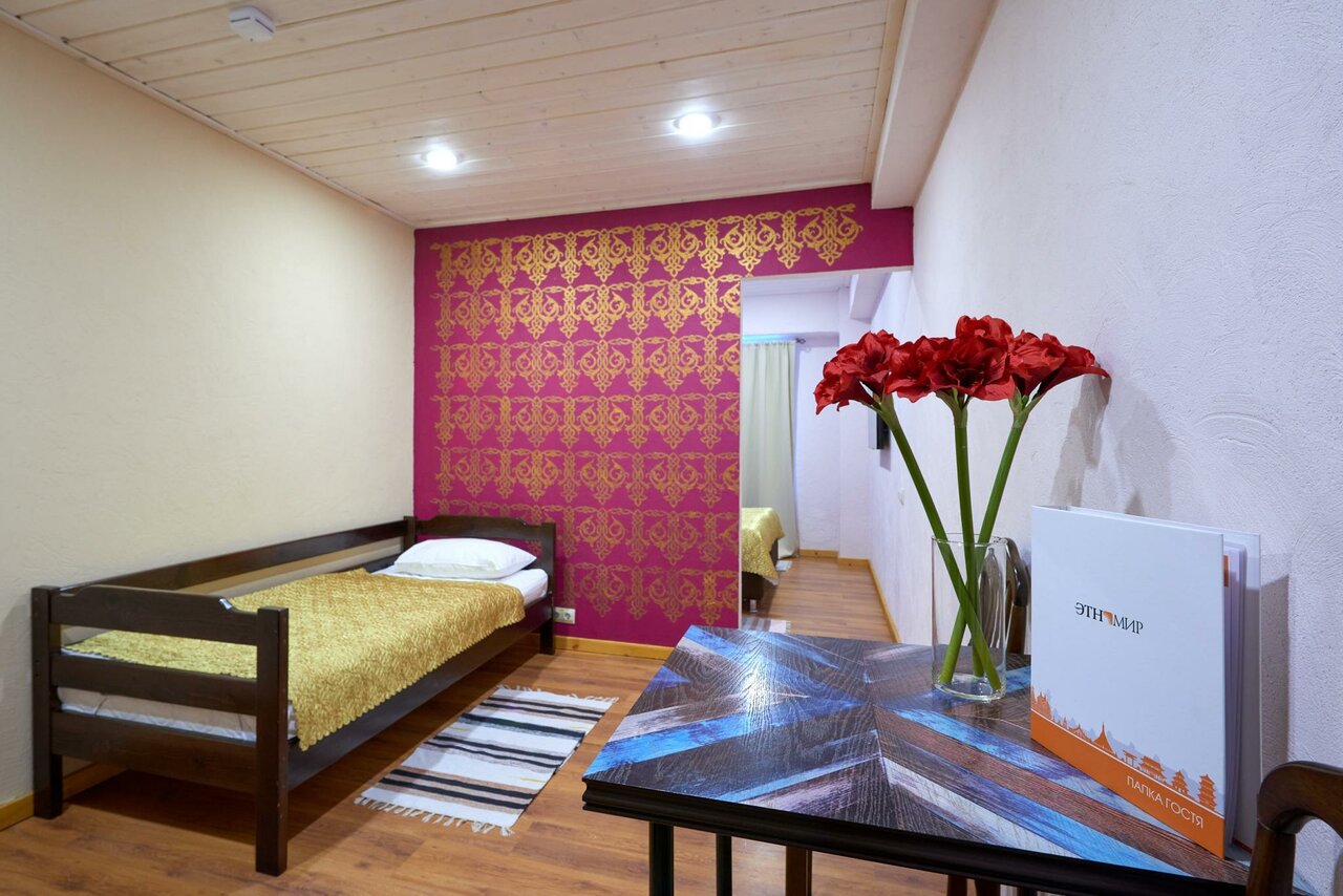 Номер неплохой, но помещение ресепшена напоминает времена совка. Ресторан Чайхона вечером, видимо не работает — около 21:00 там никого не было из посетителей. Наутро там же подают крайне посредственный завтрак — все холодное и не вкусное. Отели с включенным завтраком в Этномире вообще выбирать не рекомендую — лучше нормально уж поесть в кафе горячую еду.