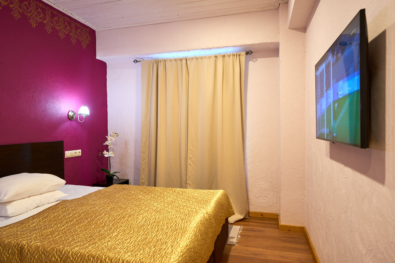 Проживали в отеле на мартовские праздники. Забронировали последний номер, который без окон, в середине здания. Сначала боялась, что не смогу там жить, т.к. клаустрофобия. Но, на удивление, очень недурно! Имитация окна с подсветкой даже по утрам имеет плюсы. Солнце не светит в глаза, спи себе, сколько угодно. Кровати удобные, но односпальные и сдвинутые. Парам стоит учесть, что разъезжаются. В ванной сантехника норм, диванчик, кресла, столик, чайник, чай, кофе. Вентиляция работает хорошо. Соотношение цена-качество на уровне. Интерьер в китайском стиле. Имейте ввиду, что нет телевизора. Мы брали с собой ноутбук и смотрели телепрограммы на нем. А так территория огромная и развлекух хватает. Завтрак в этом отеле был включен и проходил в ресторане Чайхана. Шведский стол на уровне. Рекомендую.