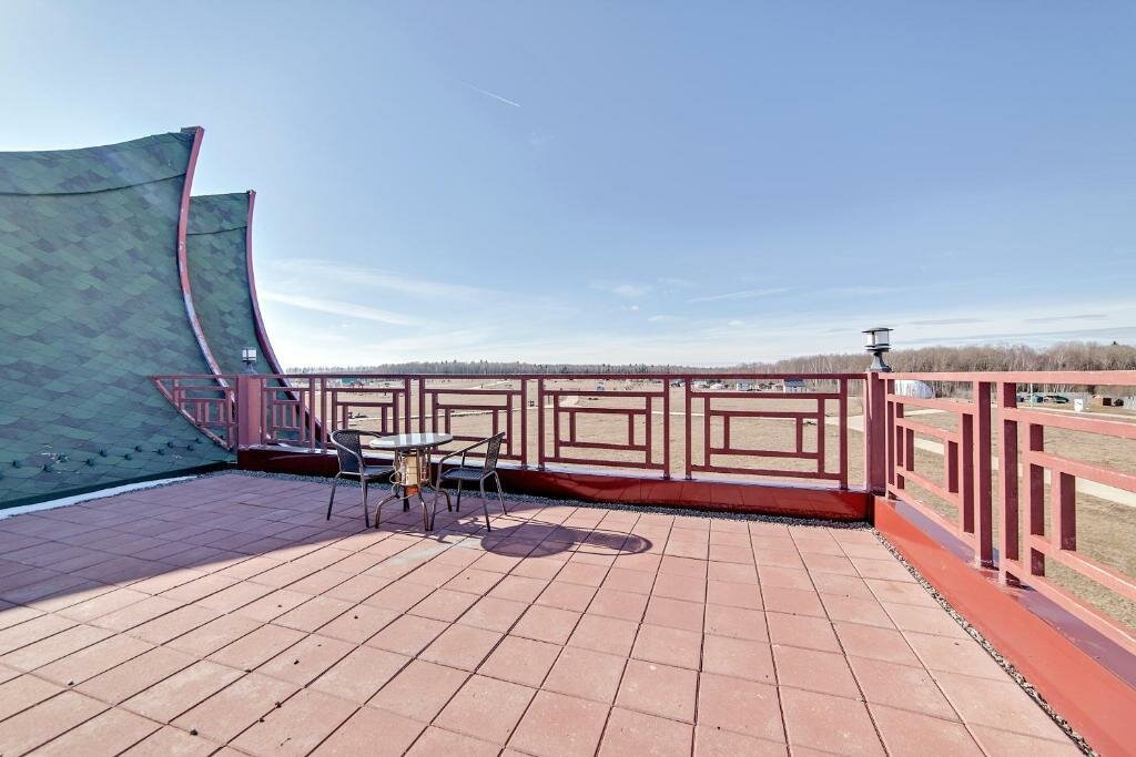 Расположена в деревне Петрово на территории Этно-деревни (ул. Мира, 2). Четырёхзвёздочный дизайн-отель с номерами от 6500 ₽/ночь. Удобства: кондиционер, Wi-Fi, холодильник, телевизор, фен, кухонный уголок. На территории: ресторан, бар у бассейна, сауна, баня, салон красоты, детская площадка, игровая комната, прокат велосипедов и катание на лошадях. Доступны конференц-зал, прачечная, камера хранения. Заезд с 14:00, выезд до 12:00. Круглосуточная стойка регистрации.