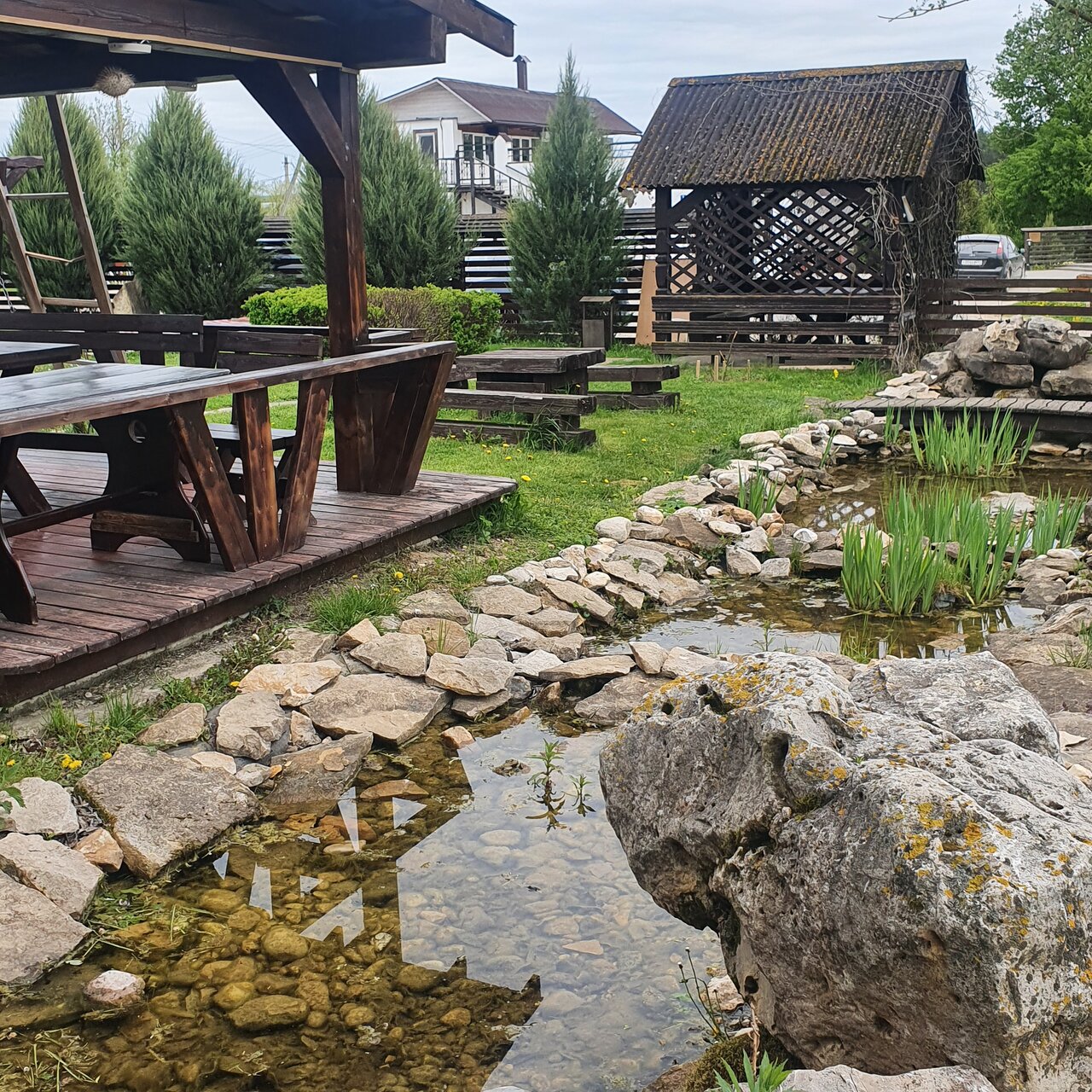 Ухоженная территория, стильное оформление домиков и веранда, есть мангалы. Домики тёплые, чистые. На территории работает кафе.