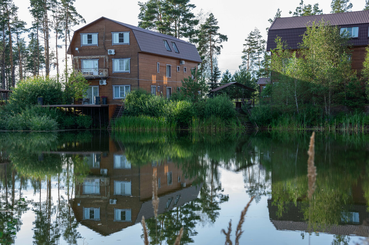 - Наличие парковки.; Уютные и комфортные номера.; Большая и красиво обустроенная территория.; Близость к реке Пра.; Прекрасные пруды для купания.