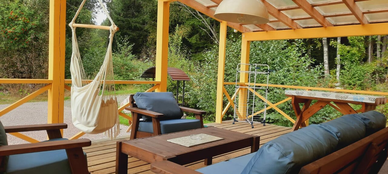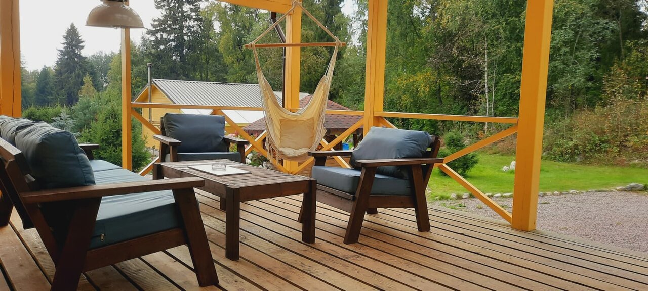 К услугам гостей — уютные номера с кухонными уголками, звукоизоляцией, телевизором, феном и чайной станцией. На территории есть бесплатная парковка, сауна (платно), баня, летняя веранда, терраса с камином, детская площадка и галечный пляж. Развлечения включают рыбалку, катание на лодках, лыжах, настольный теннис и бадминтон.