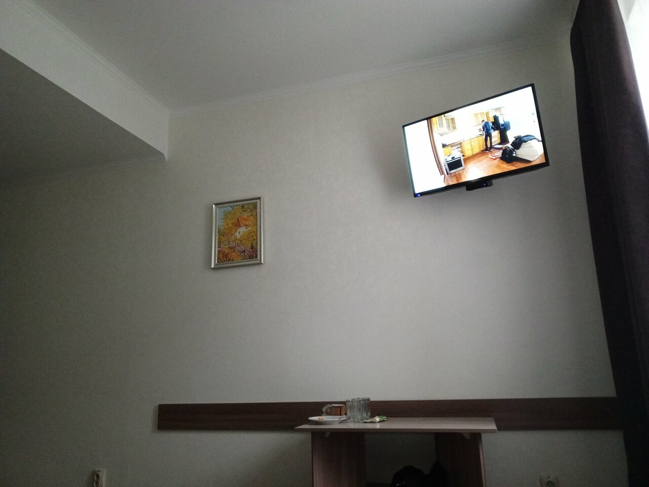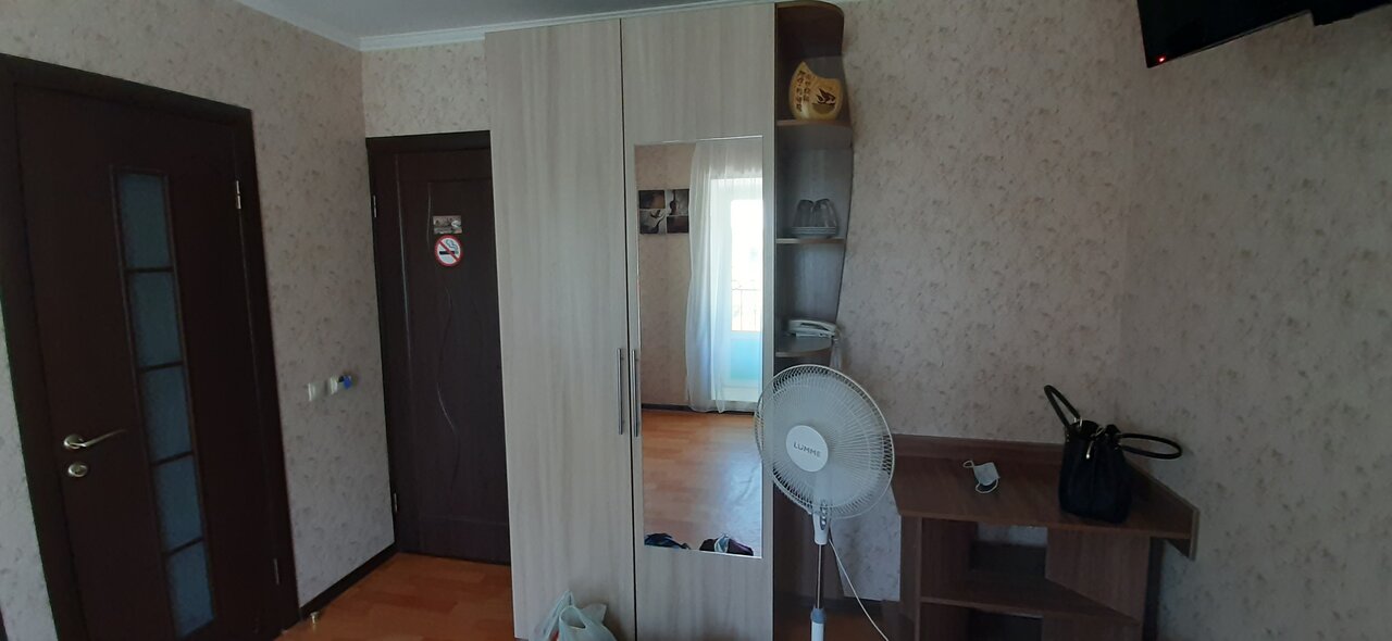 Обыкновенная ночлежка. Всё мелкое. Мелкая душевая, туалет. Кухня без окон. Окна на пыльную проселочную дорогу. Балкончик не о чем. В номере чисто. Холодильника нет. На балконе можно курить, можно шуметь. Расположен в посёлке на площади. В доме магазин, охраны нет. Войти можно и через чёрный ход.