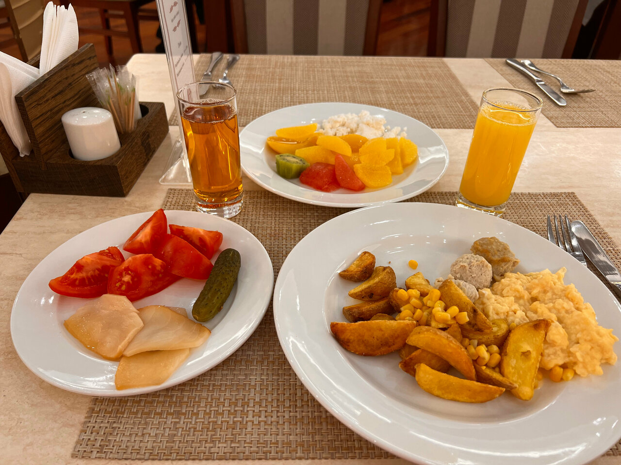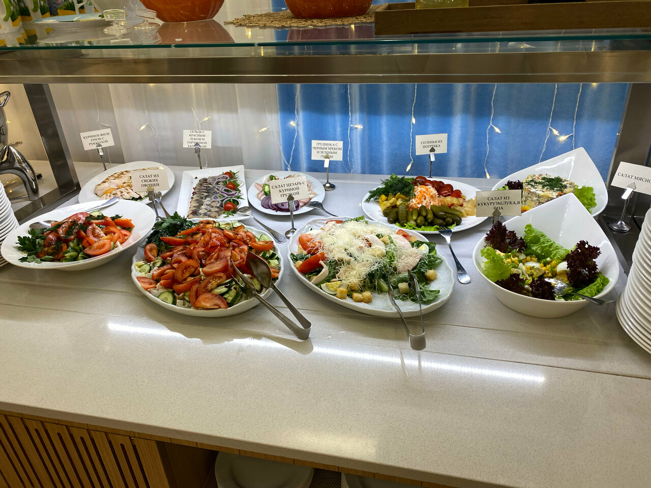 Чистая и приятная территория. Отзывчивый и добрый персонал. На завтраке было большое разнообразие, в обед — чуть скромнее. Бассейн чистый, к вечеру народу мало.