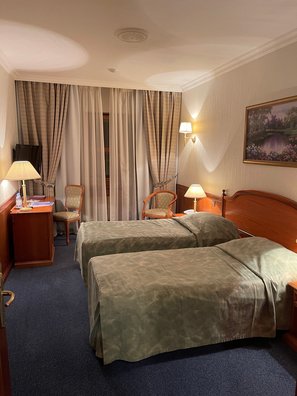 Двухместный номер с двумя односпальными кроватями, телевизором, столиком, креслом и санузлом.