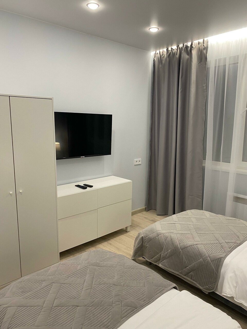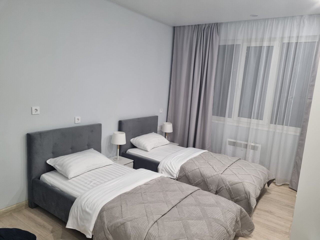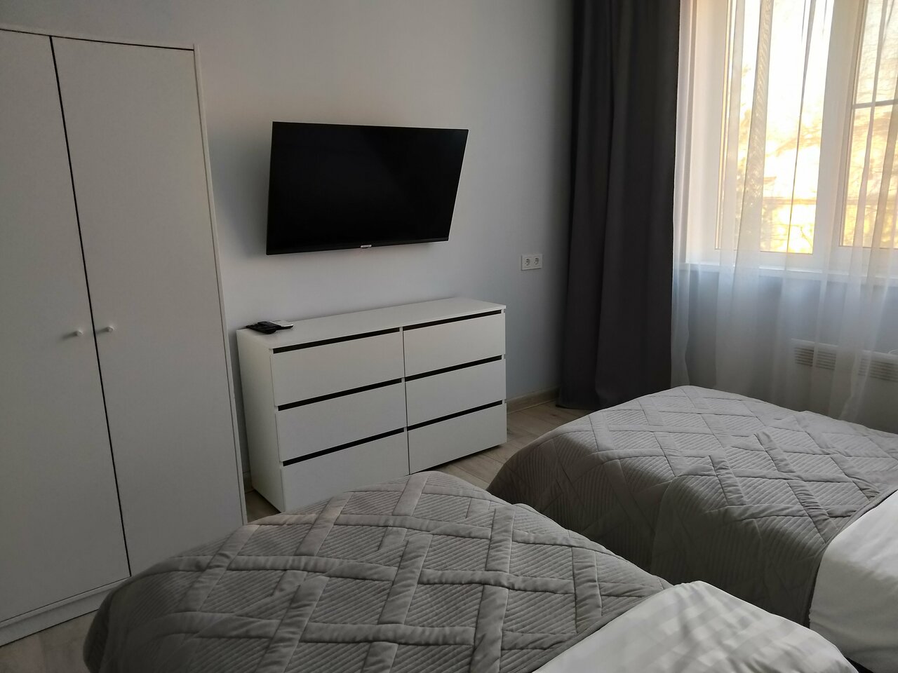 Комната площадью 18 м2 с двумя односпальными кроватями, шкафом, санузлом с душевой, феном, туалетными принадлежностями и полотенцами. Есть холодильник, чайник, Smart TV, WiFi