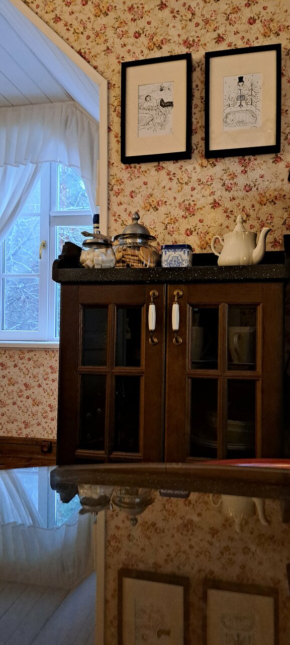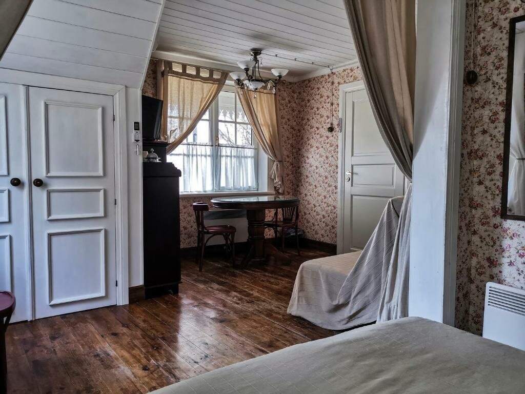 Очень уютный отель в стиле 19 века. Мало номеров, есть посуда, микроволновая печь, печенье, можно перекусить в номере. Расположен на границе с Михайловским, удобно гулять по парку. Совсем рядом Савкина горкина-великолепные виды на Михайловское и долину реки Сороть. С удовольствием приехала бы ещё!
