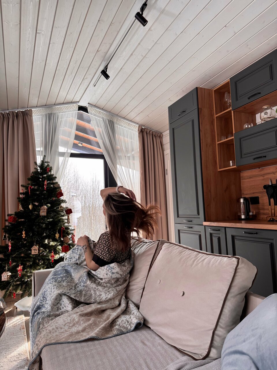 Очень милый и уютный домик. Мега эстетичный, можно сделать классные фотки для себя и семьи. Заехали в снежную погоду,атмосфера как в сказке . Камин, на фоне фильм рядом ёлочка , а за окном снежок