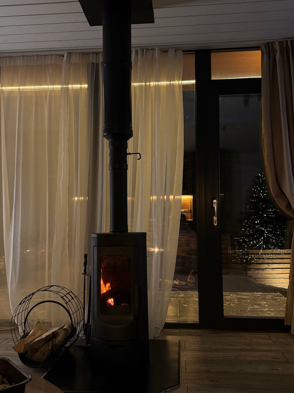 - Атмосферное место в снежную погоду (камин, ёлка, снег).