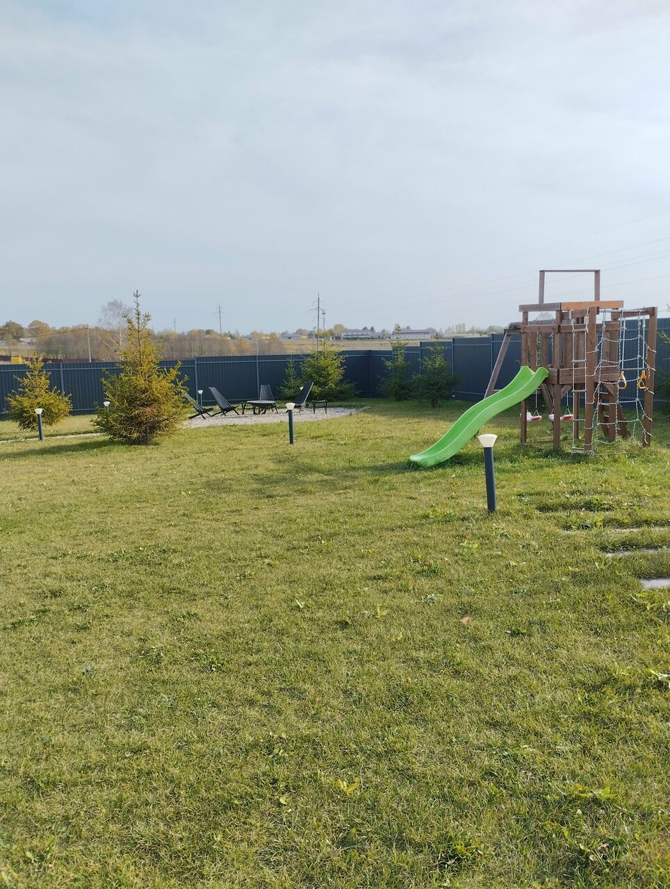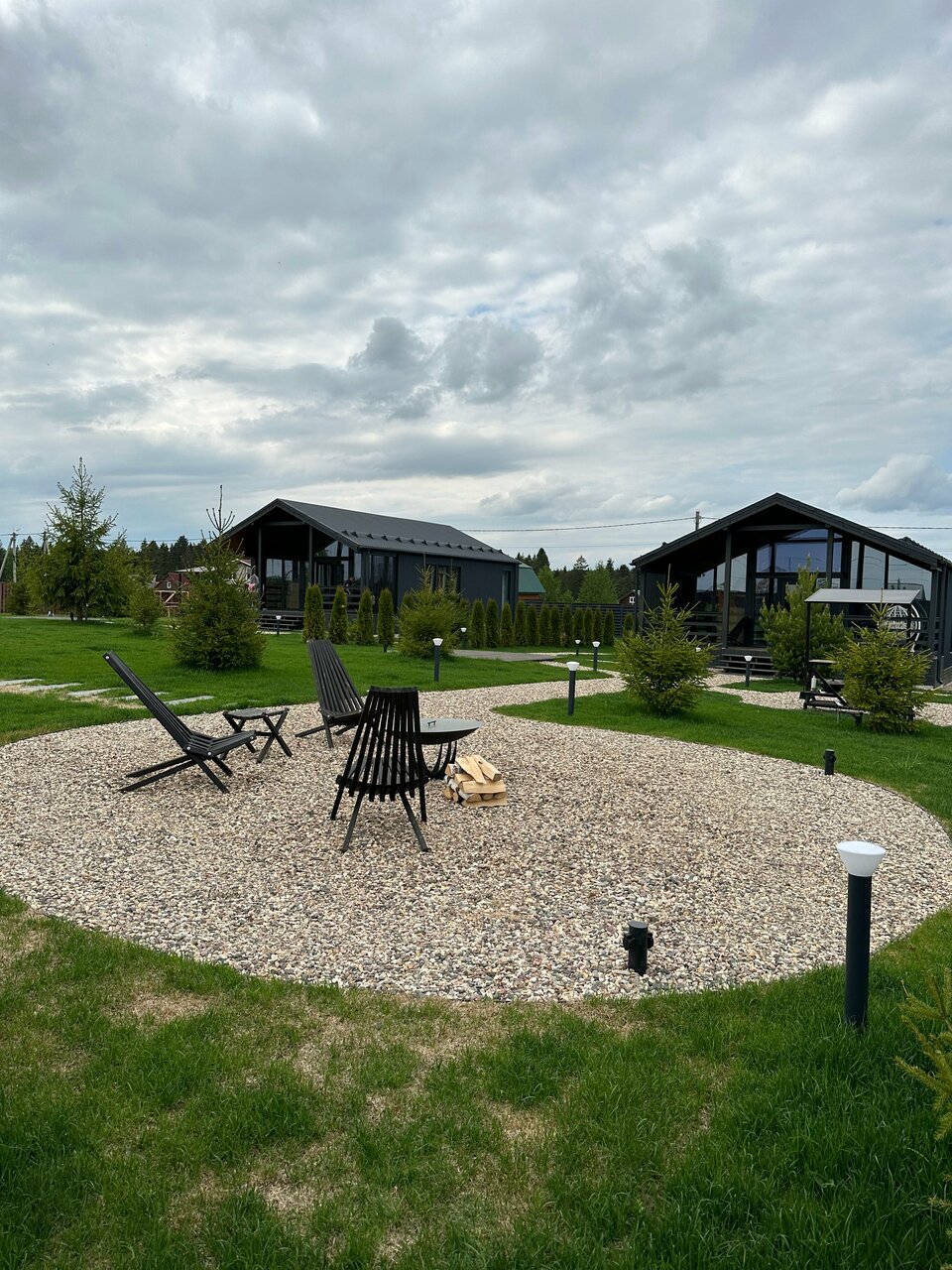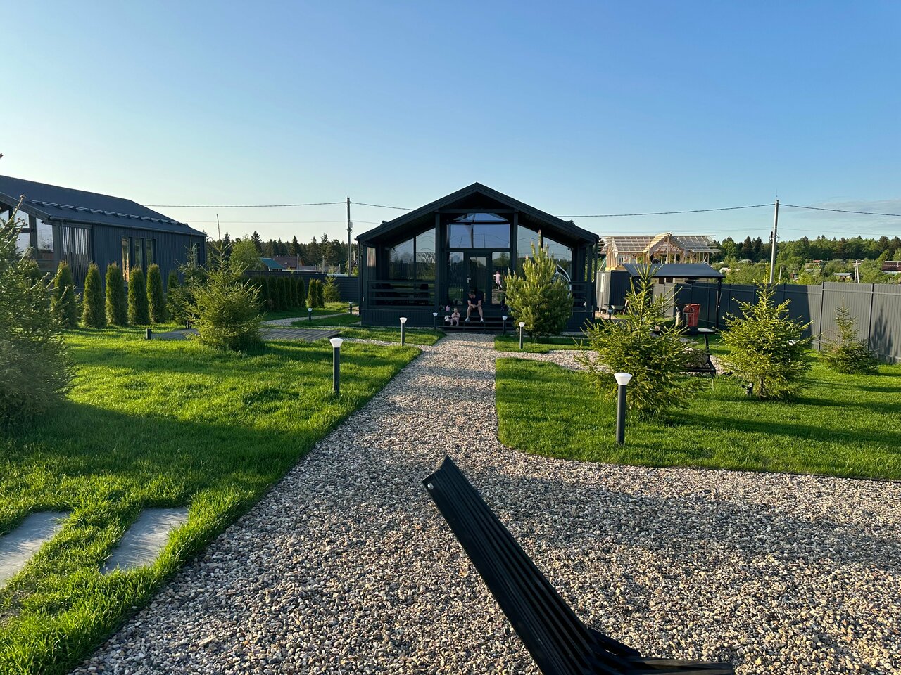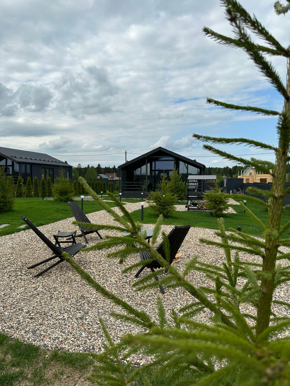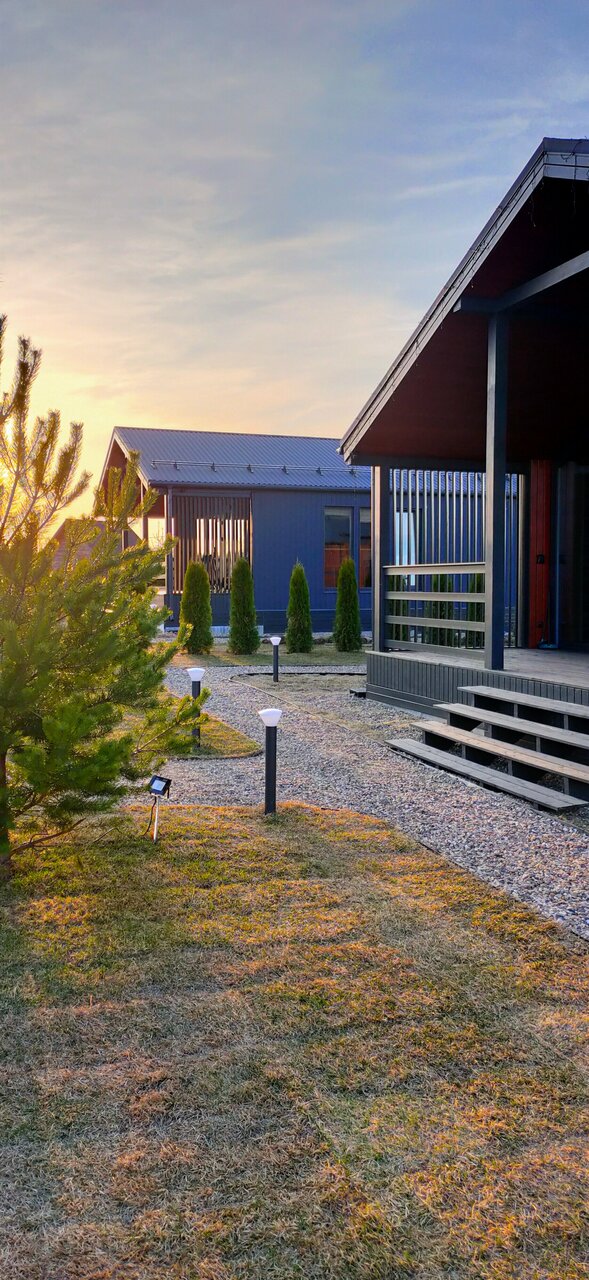 Замечательные дома со всеми удобствами. Есть сауна. Посуда, стиральная машина, утюг и т.д., все как дома Большая территория с мангальной зоной, уютные островки с кастровыми чашами. Детская площадка с горкой и качелями. Можно с животными. Современно, уютно, красиво.