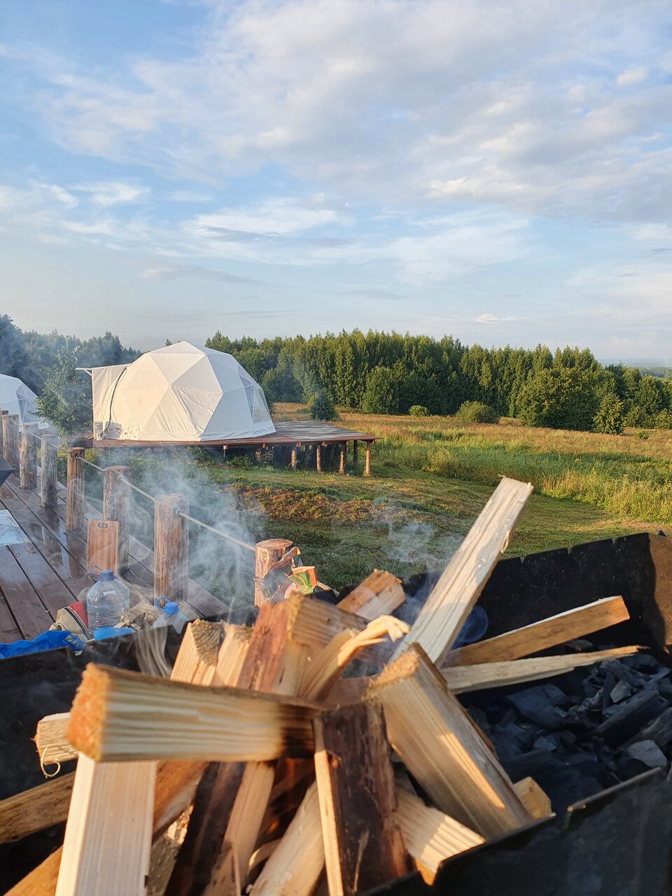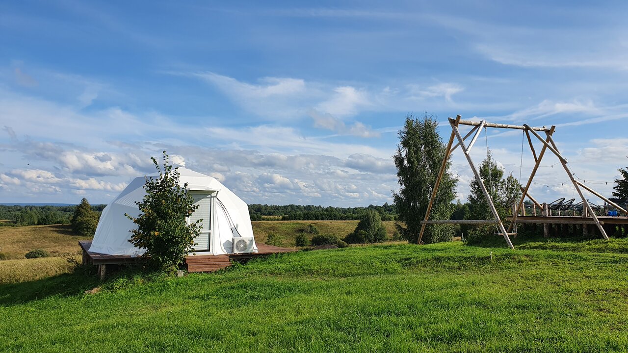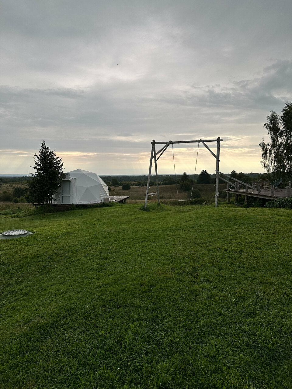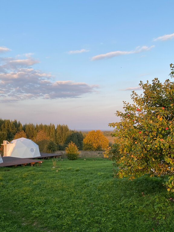 Великолепное, уединенное место! Прекрасный вид на долину, уютные купола. Ночью в куполе тепло. За каждым куполом закреплён свой санузел с туалетом, умывальником и душевой кабиной, есть фен. Великолепная липа, под которой можно укрыться от солнца. Хорошие, сытные завтраки. Отдельный плюс, что можно приехать с собакой. Территория обработана от клещей. Для гостей с детьми есть детская площадка. В общем купале есть настольные игры, небольшая библиотека, бесплатные велосипеды.