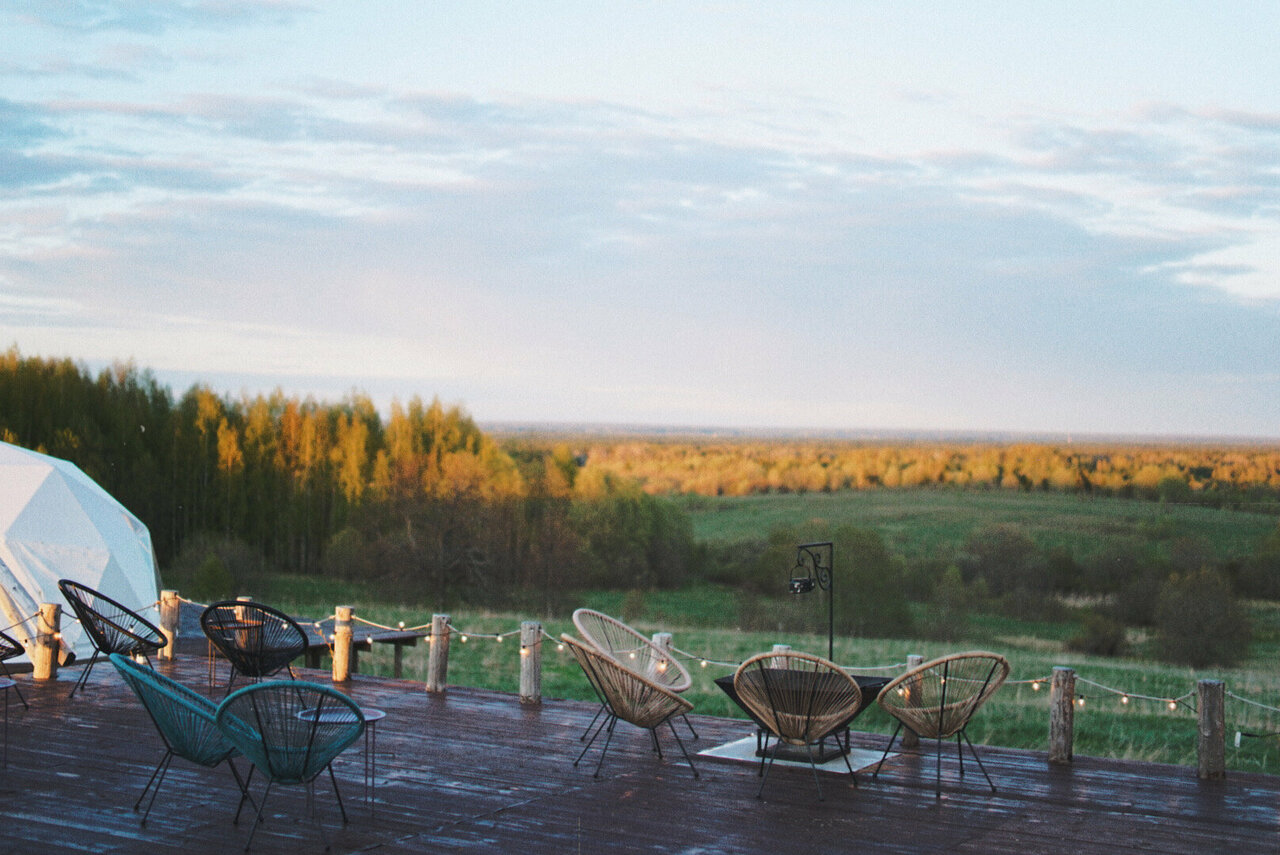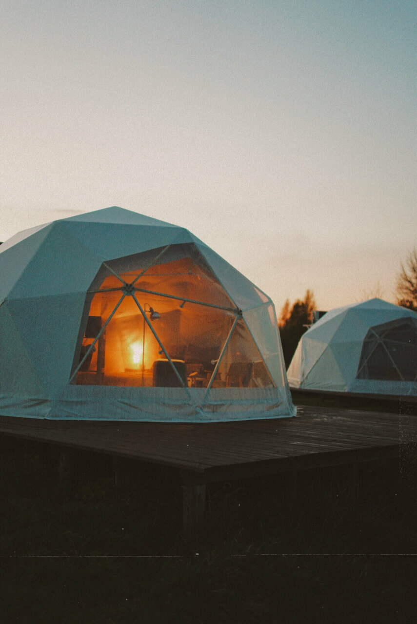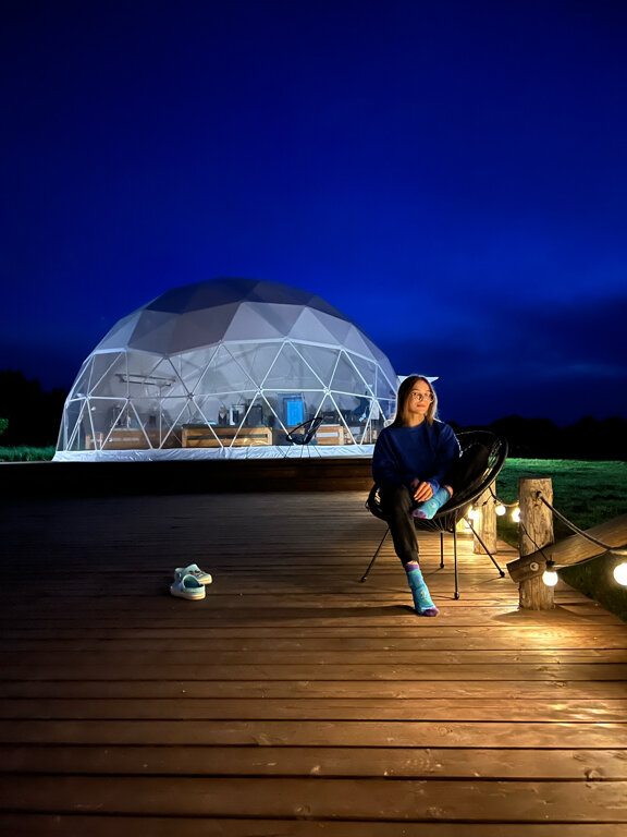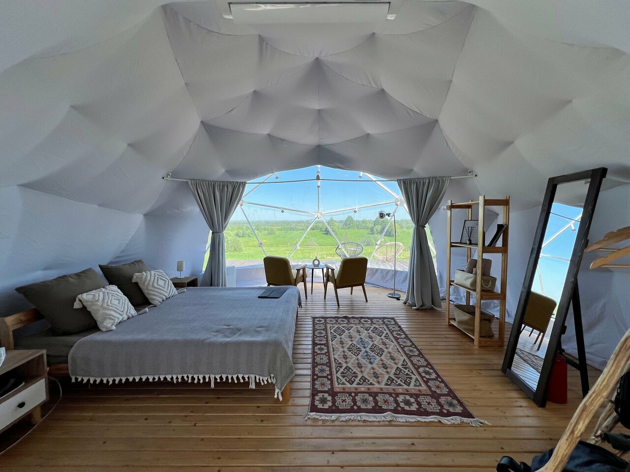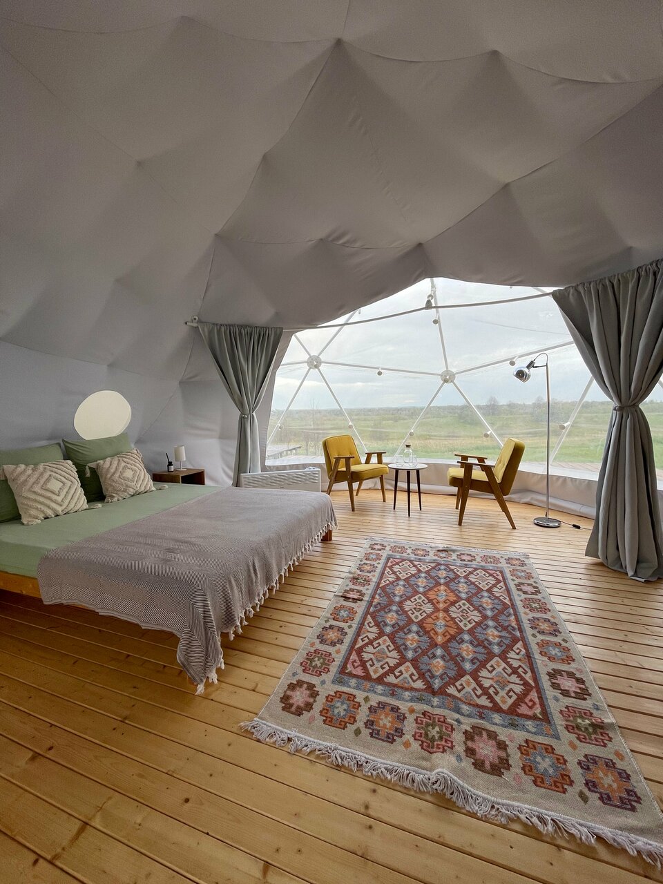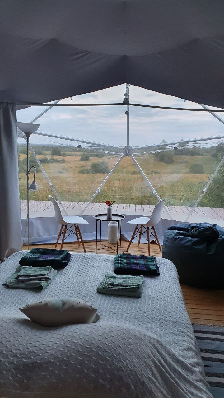 Светлые купола с панорамным окном. В куполах есть все для комфортного проживания: розетки, деревянная эстетичная мебель, полотенца, пару крафтовых чашек для утреннего кофе и широкая двухспальная кровать.
