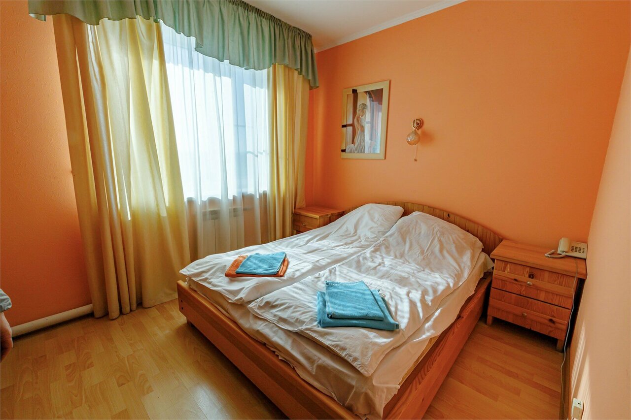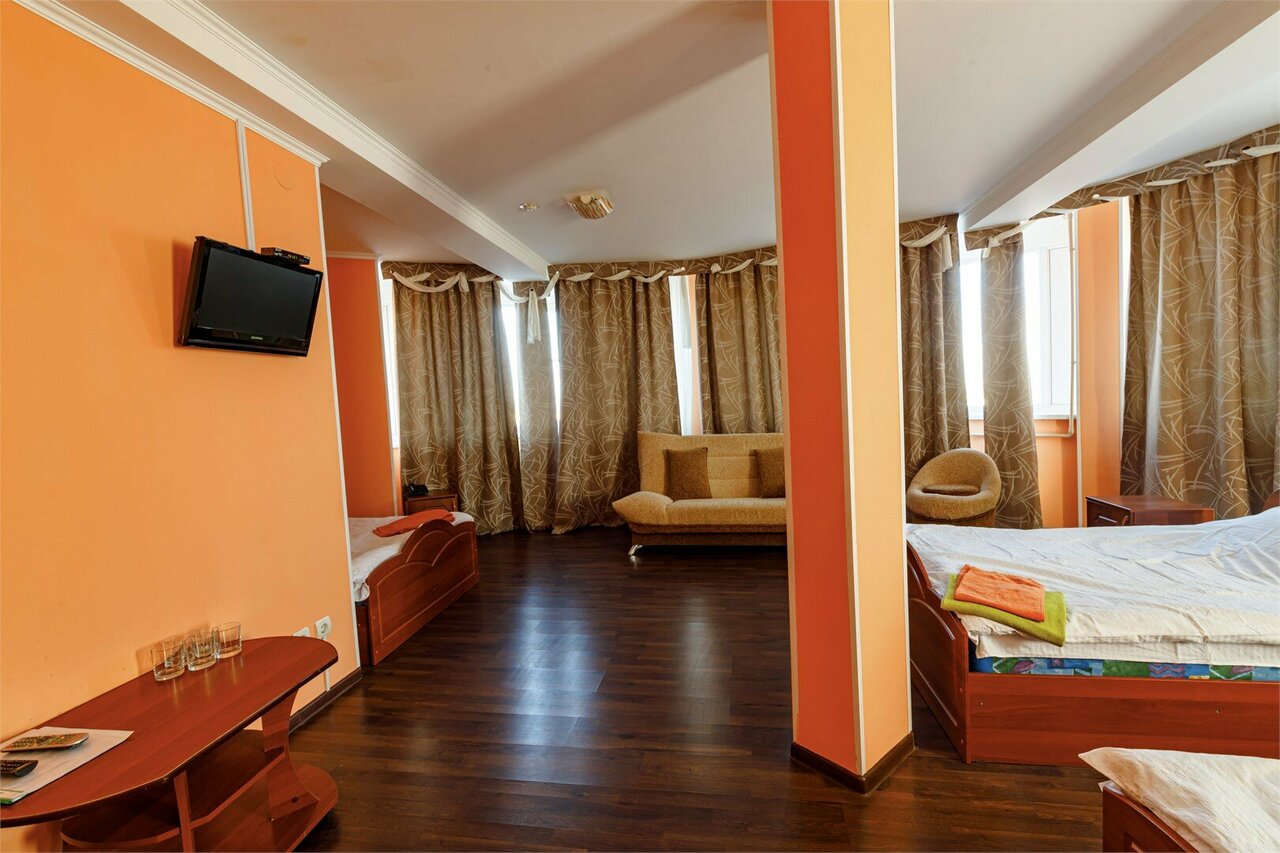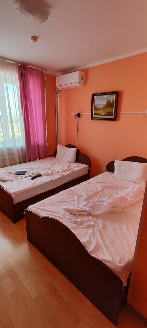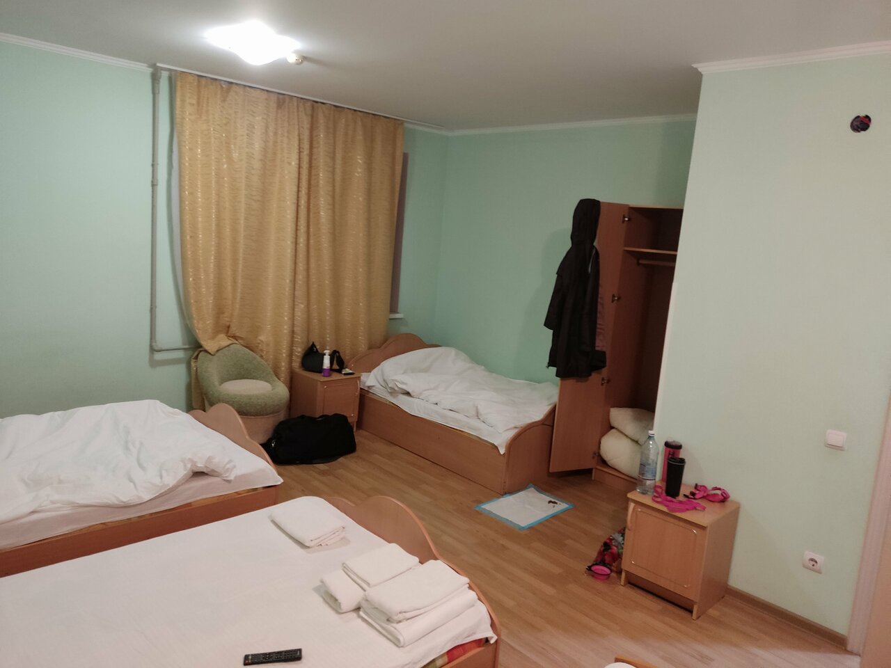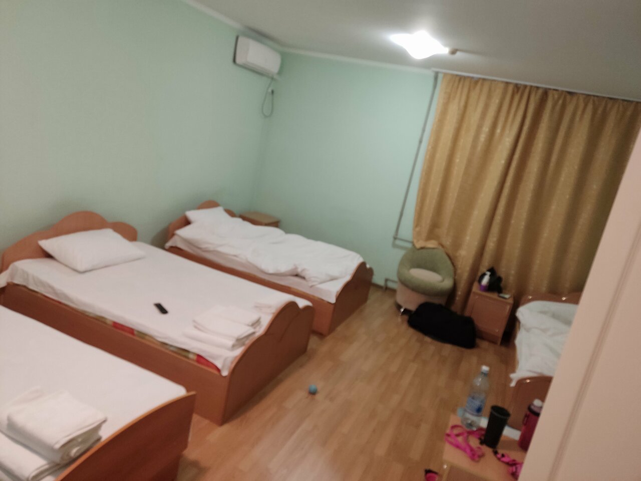 Бронировали за ранее номер за 4-2 взрослых, 2 ребёнка 12 и 5 лет 2200 без кондиционера и 2500 с кондером. По итогу кондиционер есть во всех номерах, просто Вам выдаётся от него пульт за 300 деревянных. Итак номер на 4 этаже, оказывается на каждом этаже разные номера по комфортности, 3 большие кровати, может смело уместится 2 человека на каждой, с матрасами из которых торчат пружины, телевизор, шкаф и пара тумбочек прикроватных. Ванная вместе с туалетом, внутри ногомойник с шторкой вода брызжет в разные стороны на пол, умывальник и белый друг. 4 звёзды только лишь приветливому персоналу.