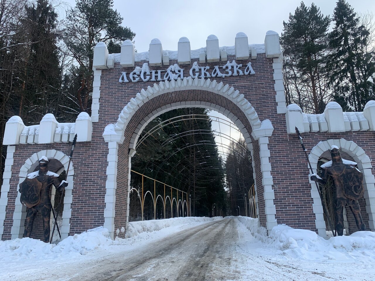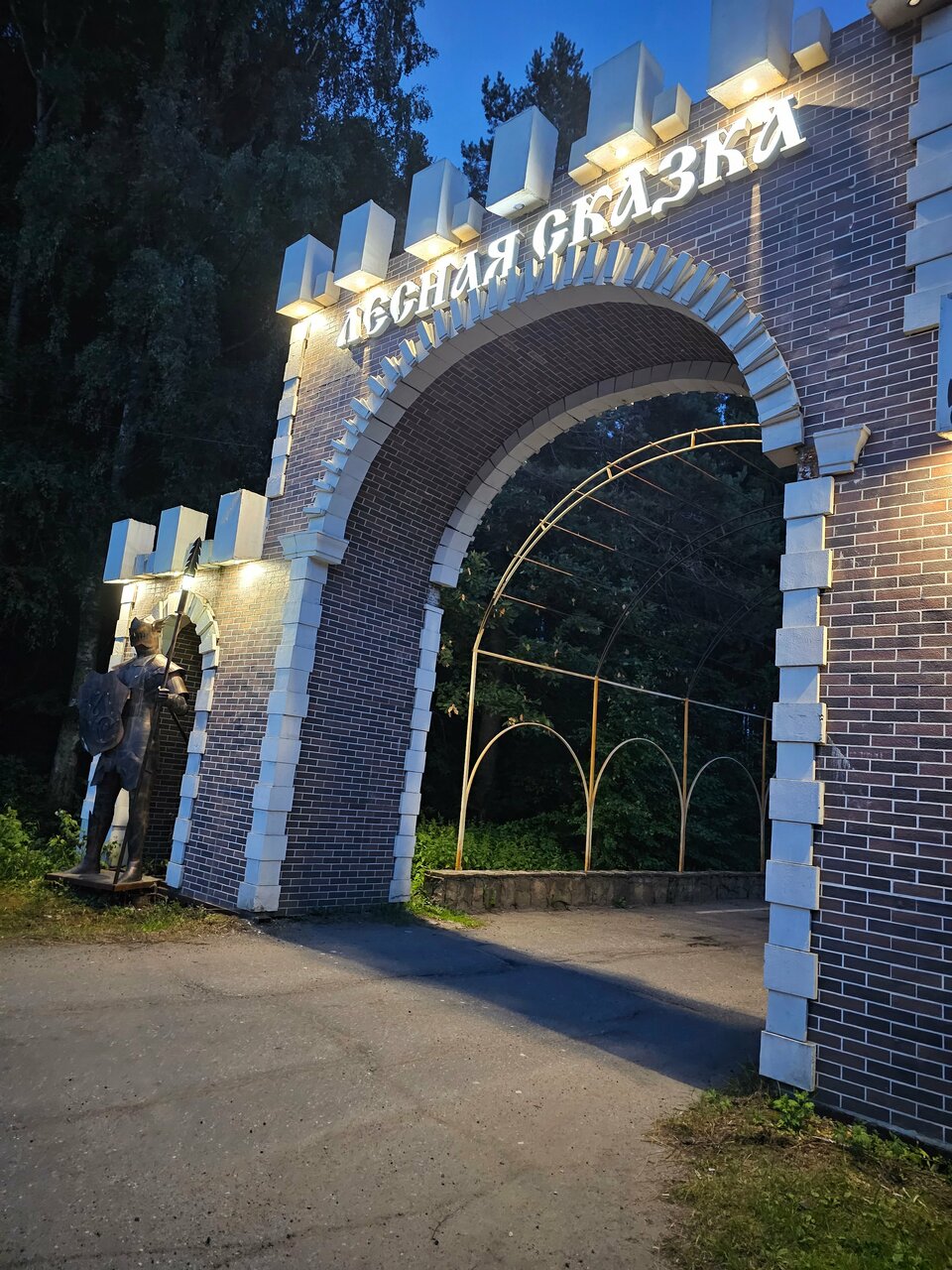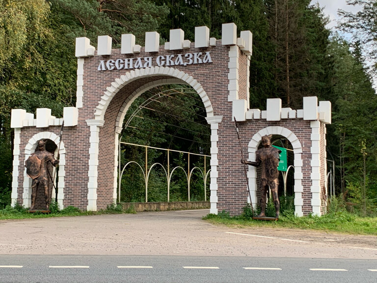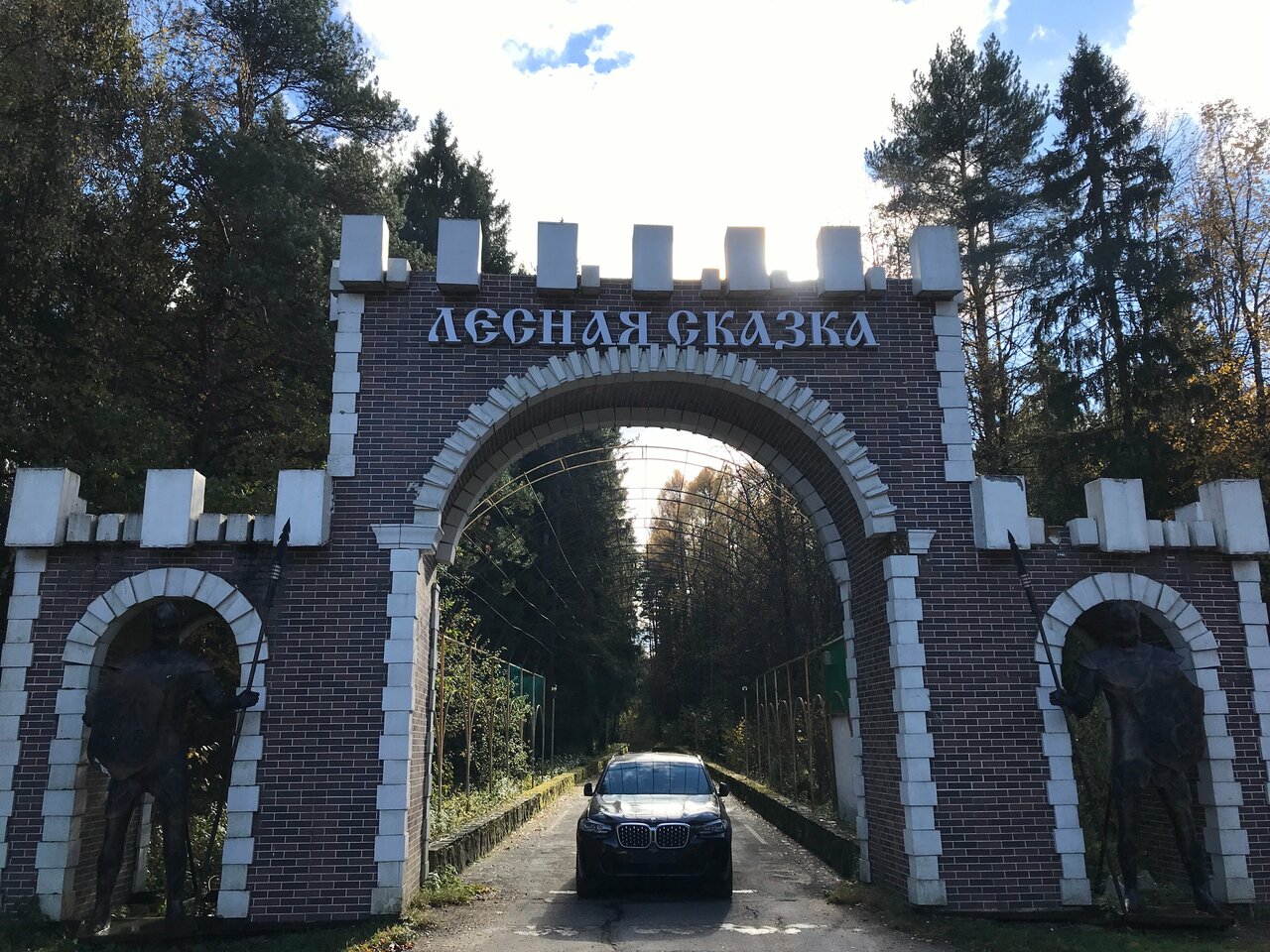 - Красивый въезд под старину (статуи рыцарей, каменный мост).