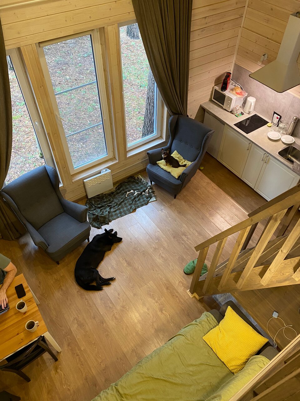 Супер место! Особенно если у вас есть собака и вы хотите отдохнуть вместе с ней. Интерьер, мебель и техника в домиках — супер. Сами домики изолированы, тишина вокруг эвосхитительна, рекомендую это место всем!