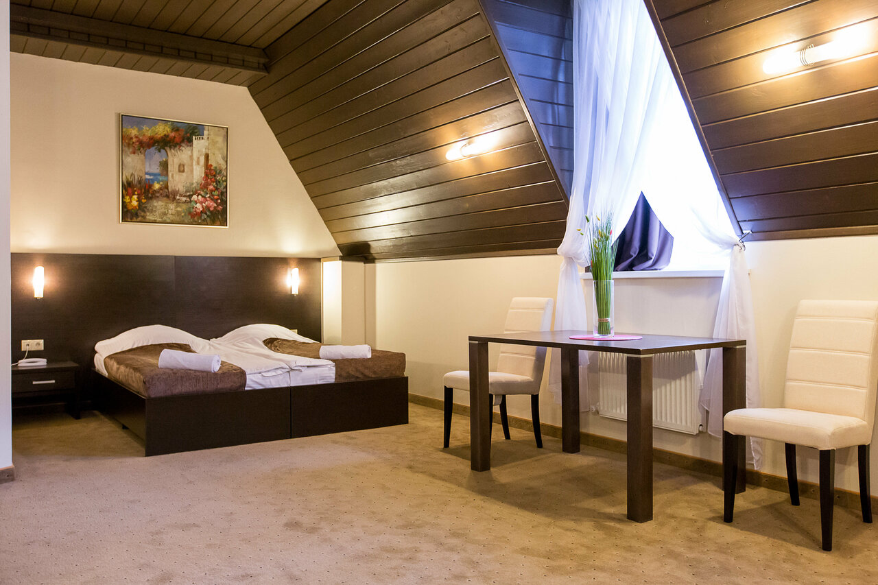 Услуги и удобства: мансардные окна, гардероб, рабочий стол, мягкая мебель, телефон, телевизор с плоским экраном, ванная комната, фен, туалетные принадлежности, комплект полотенец.Площадь номера: 38 кв. метровРазмер кровати: 1 двуспальная