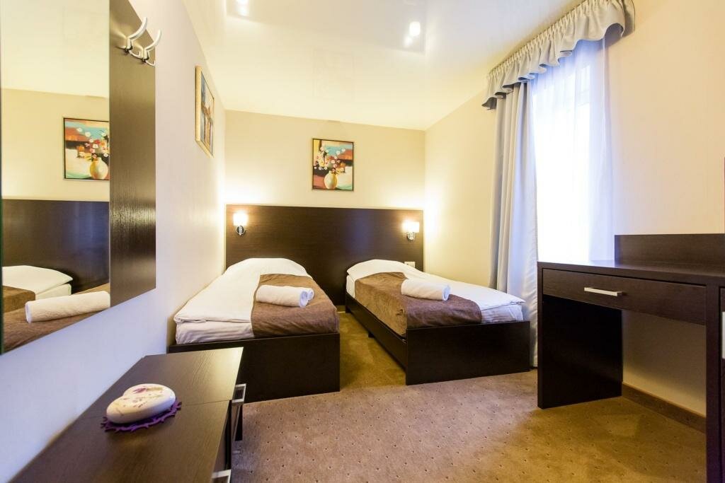 Площадь номера: 18 кв. метровЧасть номеров с балконами.Размер кровати: 2 односпальные или 1 двуспальная. Одноместное или двухместное размещение, с питанием и без.