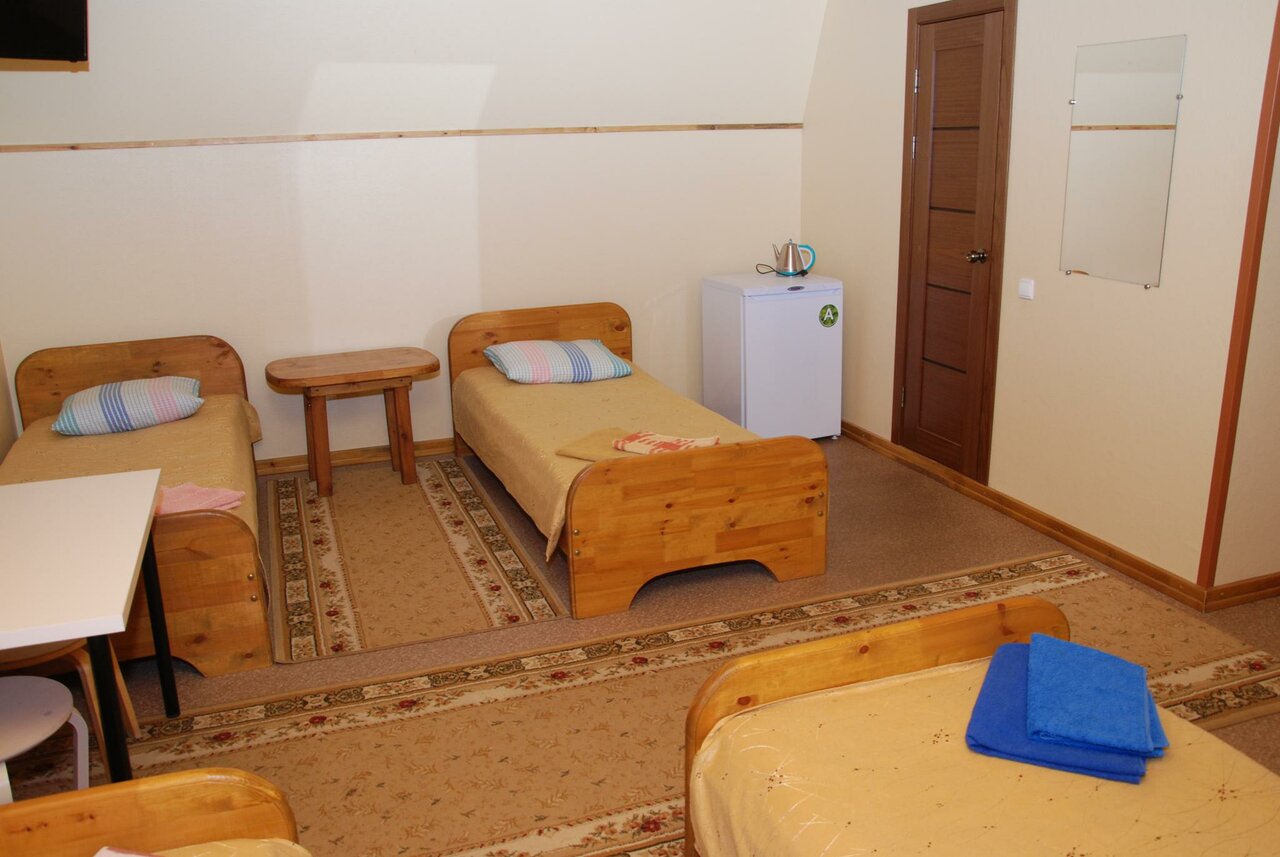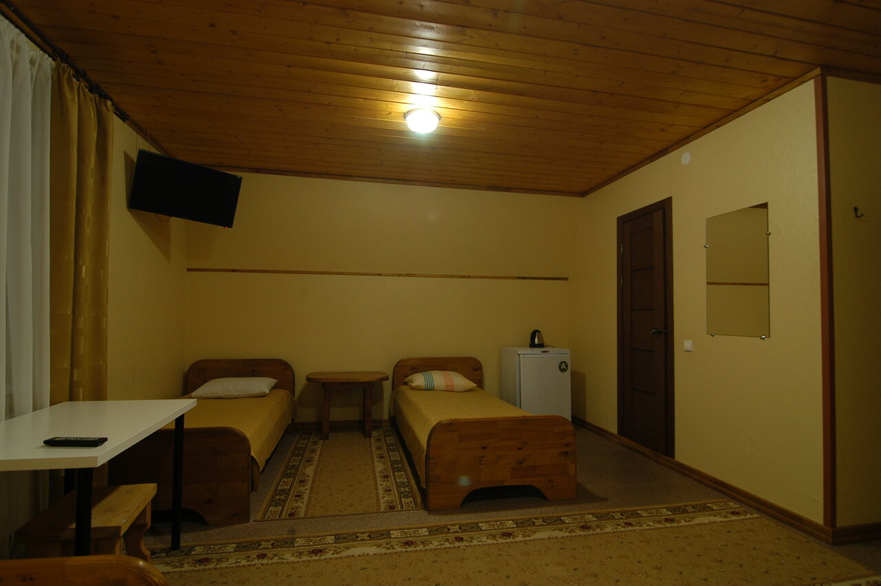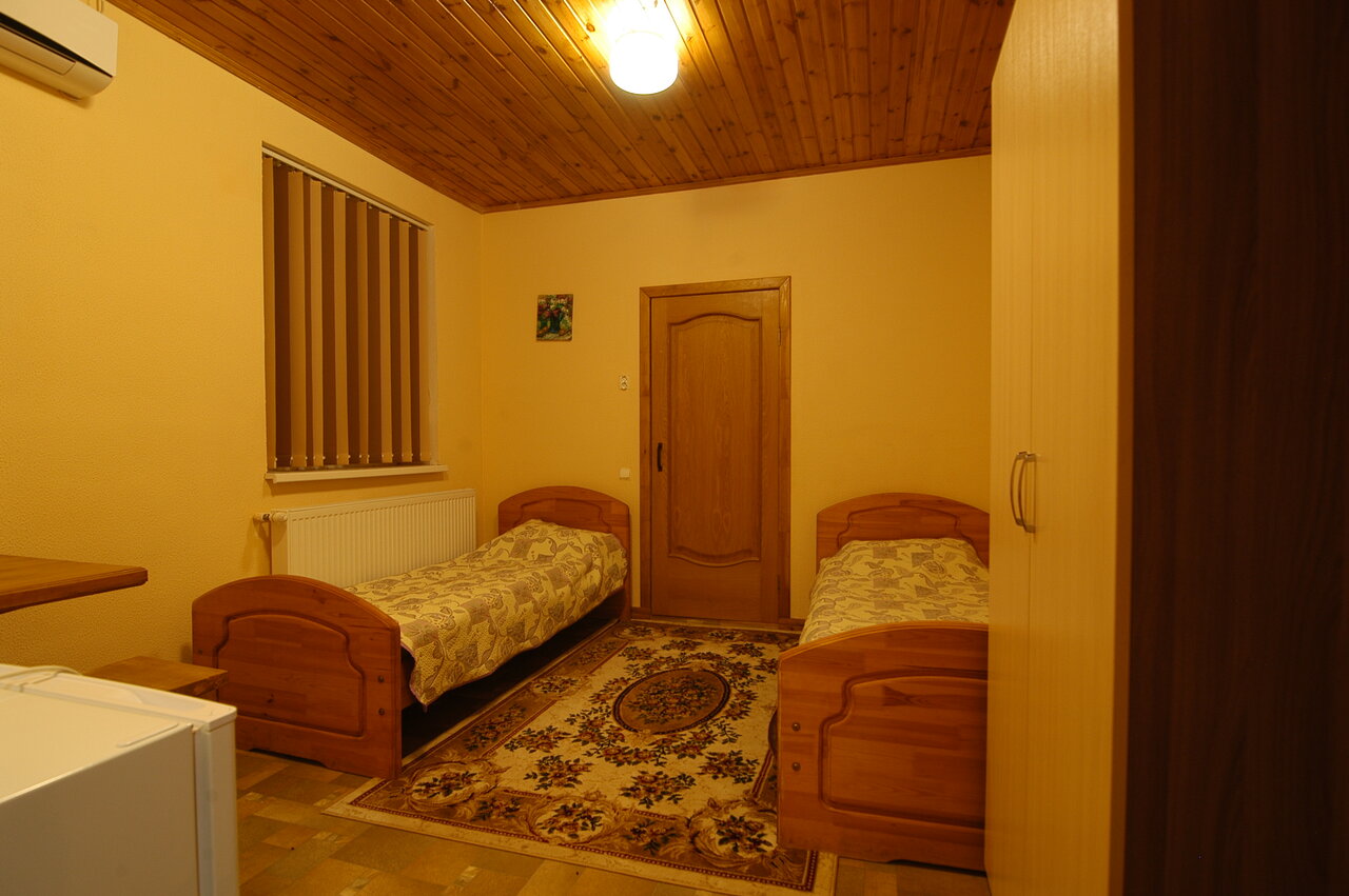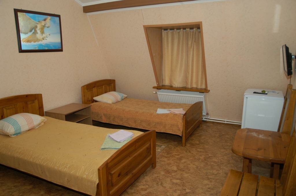 Стандарт со всеми удобствами . Три раздельные кровати, холодильник в номере ,ТВ, душ, умывальник, унитаз , комплект полотенец ,пользование общей кухней мангалом,автостоянкой Скидки от двух суток. Номеров несколько,звоните.